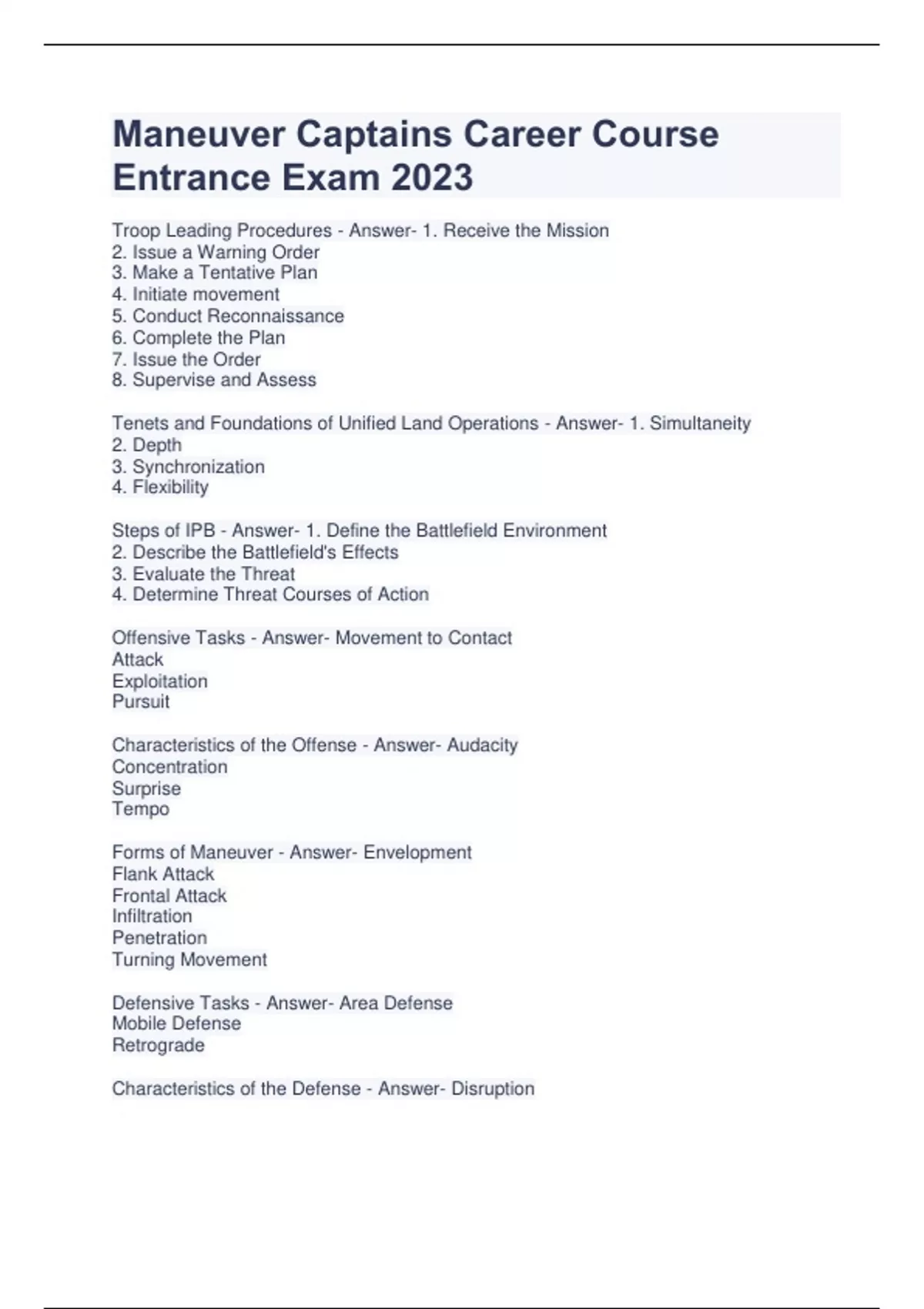 Maneuver Captains Career Course Entrance Exam 2023