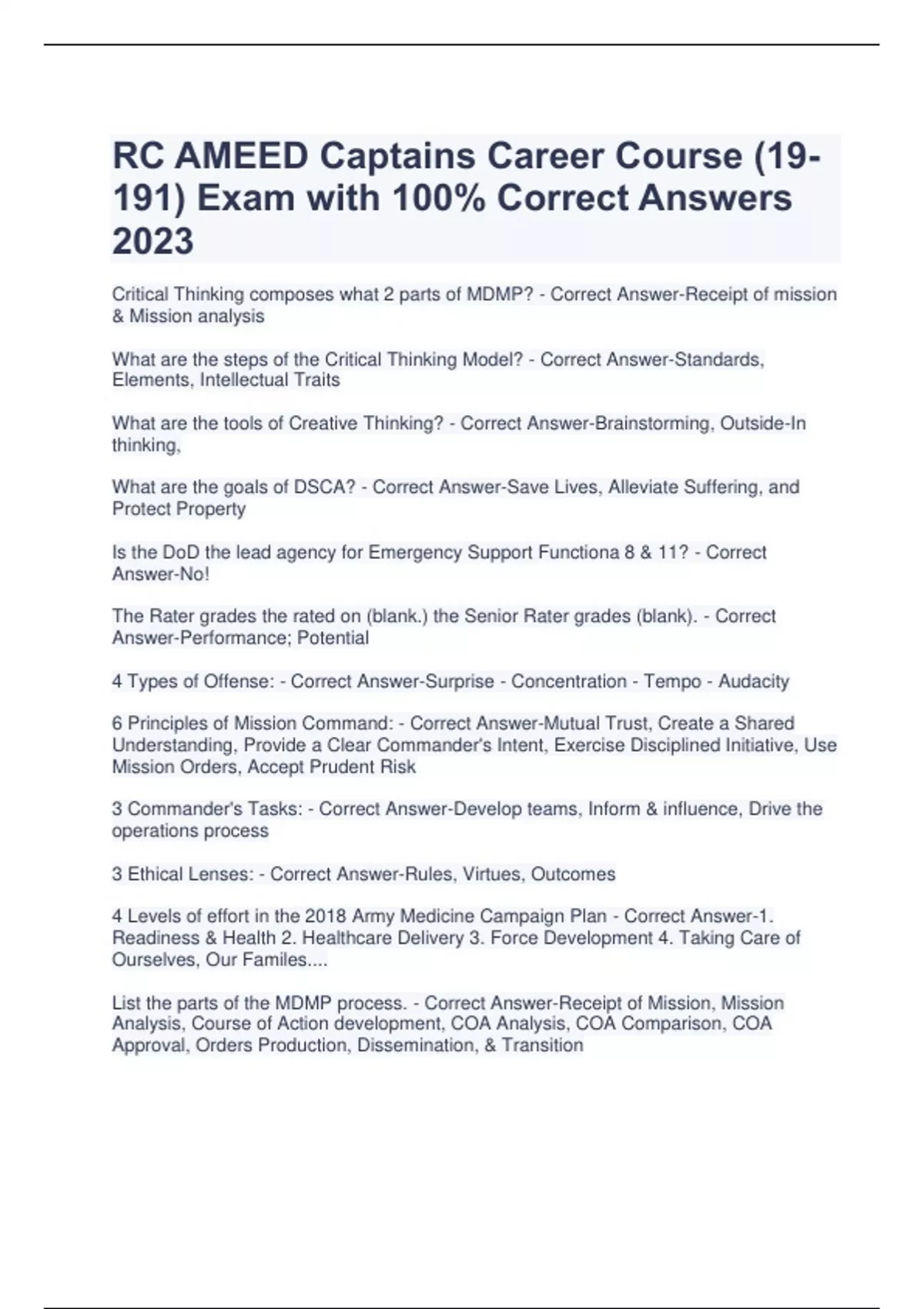 Critical Thinking composes what 2 parts of MDMP? - Correct Answer-Receipt of mission & Mission analysis What are the steps of the Critical Thinking Model? - Correct Answer-Standards, Elements, Intellectual Traits What are the tools of Creative Thinking? - Correct Answer-Brainstorming, Outside-In thinking, What are the goals of DSCA? - Correct Answer-Save Lives, Alleviate Suffering, and Protect Property Is the DoD the lead agency for Emergency Support Functiona 8 & 11? - Correct Answer-No! The Rater grades the rated on (blank.) the Senior Rater grades (blank). - Correct Answer-Performance; Potential 4 Types of Offense: - Correct Answer-Surprise - Concentration - Tempo - Audacity 6 Principles of Mission Command: - Correct Answer-Mutual Trust, Create a Shared Understanding, Provide a Clear Commander's Intent, Exercise Disciplined Initiative, Use Mission Orders, Accept Prudent Risk 3 Commander's Tasks: - Correct Answer-Develop teams, Inform & influence, Drive the operations process 3 Ethical Lenses: - Correct Answer-Rules, Virtues, Outcomes 4 Levels of effort in the 2018 Army Medicine Campaign Plan - Correct Answer-1. Readiness & Health 2. Healthc