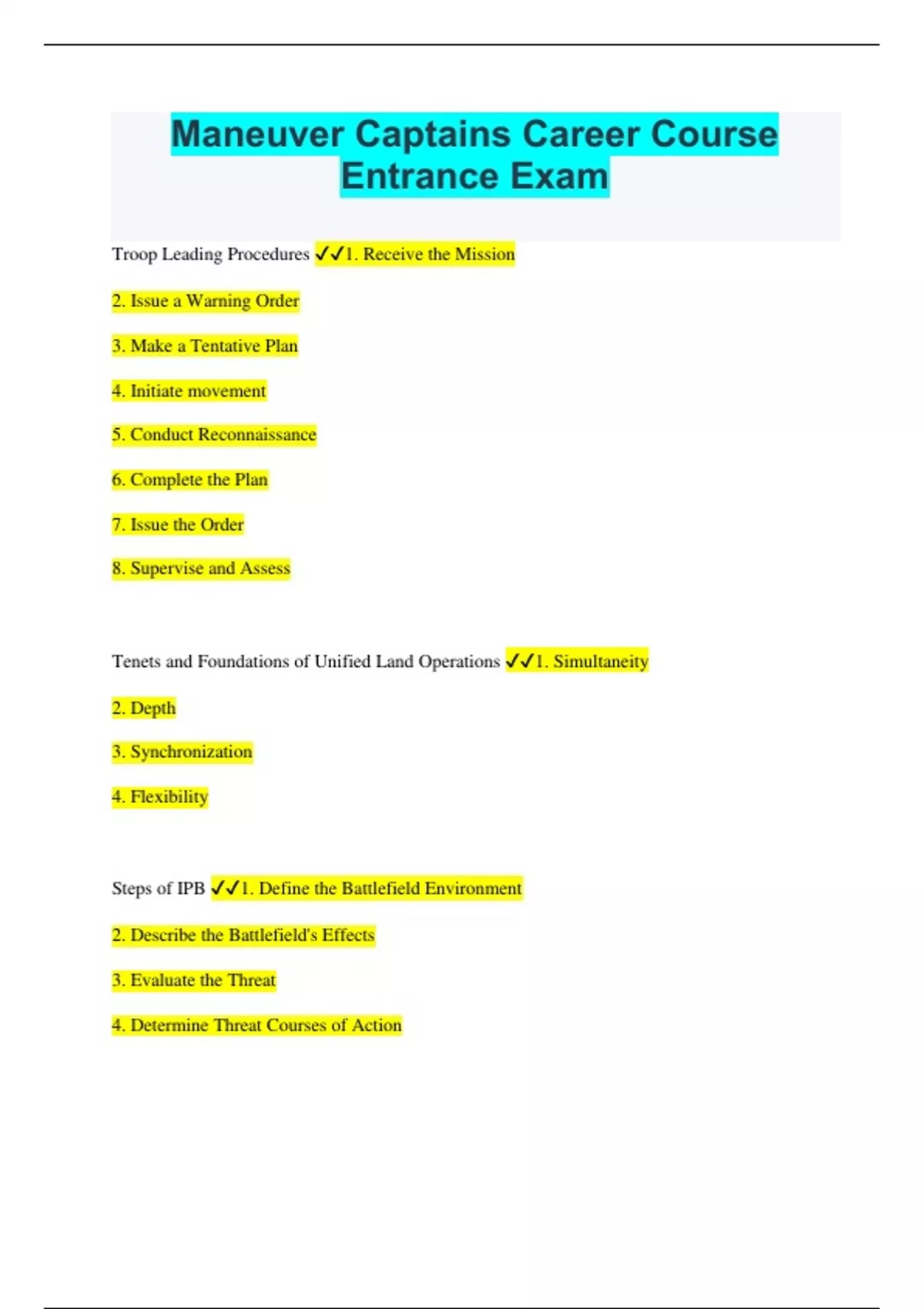 Troop Leading Procedures 1. Receive the Mission 2. Issue a Warning Order 3. Make a Tentative Plan 4. Initiate movement 5. Conduct Reconnaissance 6. Complete the Plan 7. Issue the Order 8. Supervise and Assess Tenets and Foundations of Unified Land Operations 1. Simultaneity 2. Depth 3. Synchronization 4. Flexibility Steps of IPB 1. Define the Battlefield Environment 2. Describe the Battlefield's Effects 3. Evaluate the Threat 4. Determine Threat Courses of ActionOffensive Tasks Movement to Contact Attack Exploitation Pursuit Characteristics of the Offense Audacity Concentration Surprise Tempo Forms of Maneuver Envelopment Flank Attack Frontal Attack Infiltration Penetration Turning Movement Defensive Tasks Area Defense Mobile Defense Retrograde Characteristics of the Defense DisruptionFlexibility Maneuver Mass and Concentration Operations in Depth Preparation Security The Mission Statement A short sentence or paragraph that describes the organization's essential tasks, purpose, and action. Containing the elements of who, what, when, where, and why. Decisive Point A geographic place, specific event, critical fac