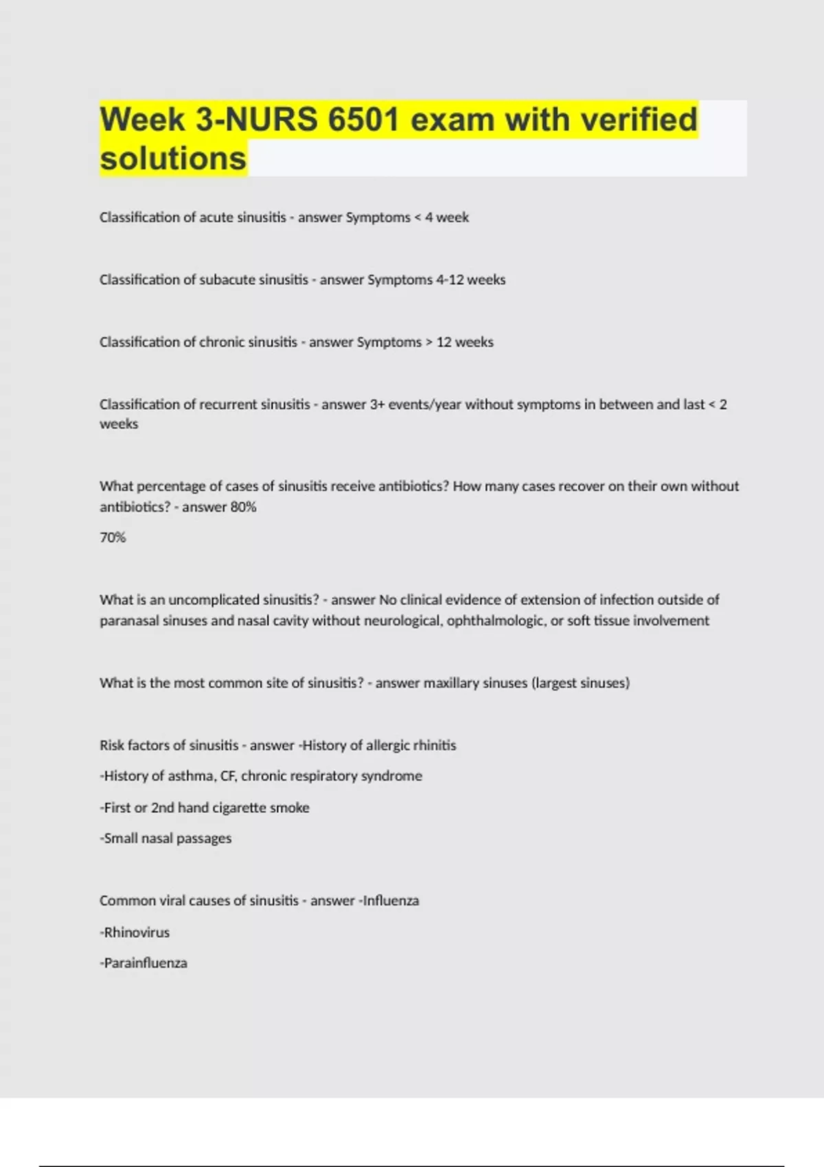 Classification of acute sinusitis Symptoms < 4 week Classification of subacute sinusitis Symptoms 4-12 weeks Brainpower Read More Previous Play Next Rewind 10 seconds Move forward 10 seconds Unmute 0:09 / 0:15 Full screen Classification of chronic sinusitis Symptoms > 12 weeks Classification of recurrent sinusitis 3+ events/year without symptoms in between and last < 2 weeks What percentage of cases of sinusitis receive antibiotics? How many cases recover on their own without antibiotics? 80% 70% What is an uncomplicated sinusitis? No clinical evidence of extension of infection outside of paranasal sinuses and nasal cavity without neurological, ophthalmologic, or soft tissue involvement What is the most common site of sinusitis? maxillary sinuses (largest sinuses) Risk factors of sinusitis -History of allergic rhinitis -History of asthma, CF, chronic respiratory syndrome -First or 2nd hand cigarette smoke -Small nasal passages Common viral causes of sinusitis -Influenza -Rhinovirus -Parainfluenza -RSV -Adenovirus Common bacterial causes of sinusitis -Strep pneumonia -H flu -Moraxella catarrhalis -Staph aureus Fungal sinusitis is ________ and typically seen in _______________ Rare Immunosuppressed patients Symptoms of acute rhinosinusitis -Purulent anterior nasal dx -Purulent or discolored posterior nasal discharge -Nasal congestion or obstruction -Facial congestion, fullness -Hyposmia, anosmia -Fever -HA -Ear pain, pressure, fullness -Halitosis -Dental pain -Fatigue 3 cardinal symptoms of bacterial sinusitis 1) Mucopurulent discharge 2) Nasal obstruction 3) Facial pain, pressure 4 cardinal symptoms of chronic sinusitis 1) Mucopurulent discharge 2) Nasal obstruction 3) Facial pain, pressure 4) Decreased or loss of smell > 12 weeks Infectious Disease Society of American (IDSA) classification of bacterial sinusitis -4 weeks of purulent nasal discharge with nasal obstruction -Facial pain for 3 days Clinical presentation of bacterial sinusitis -Fever > 101.5-102F -Duration > 10 days -Severe HA -Skin infection -Purulent nasal discharge > 4 weeks -Facial pain/pressure/fullness/dental pain (no improvement for 10 days) -Decreased smell -Cough -Fatigue -Ear pain Important PMH to illicit when assessing a patient presenting with sinusitis -History of sinus infection -History of nasal polyps -Recent head injury Sinusitis PE -VS, recent fevers? -Allergic shinier, periorbital edema -Nasal edema, erythema, discharge, septal deviation, polyps -Throat PND, erythema, lymphoid hypertrophy -Dental abscess, gingivitis -Lymph node palpation -Percussion of frontal, maxillary sinuses -Eye exam (ophthalmoscope) -Ear exam (otoscope) When should you consider a facial CT when a patient presents with signs of sinusitis? -Recurrent bacterial sinusitis -Orbital or soft tissue involvement -Comborbidities (immunodeficiency, diabetes, labs) -Facial trauma Presentation of trigeminal neuralgia Unilateral facial pain around the 5th cranial nerve Differential diagnosis for sinusitis presentation -Common cold -Dental abscess -Trigeminal neuralgia -Optic neuritis -Meningitis -Orbital cellulitis -Allergic rhinitis -Migraine or cluster HA -Foreign body -Tumor -Nasal polyps -Head injury -Fungal infection Treatment for sinusitis (symptom relief) -Analgesics (NSAIDs, acetaminophen) -Saline nasal irrigation -Antitussive (weak evidence) -Mucolytics/expectorants (guaifenesin; thins mucus) -Decongestants (3-5 days_ -Oxymetazoline -Nasal steroid -Hydration -Rest -Humidified air When doing the "watchful waiting" approach for treating acute sinusitis, when you should have patient follow to assess if antibiotics need to be started? after 7 days of no improvement with supportive therapy Oxymeetazoline use for sinusitis (Neo-Synnephrine) -Decreases nasal congestion, edema -Promotes drainage Antibiotics for sinusitis should cover what bacteria? -S pneumonia -Morexella -H flu What is the first line antibiotic choice for bacterial sinusitis? -Amoxicillin 500-750mg BID x 5-7 days -Augmentin (for high resistance risk) 875/125mg BID x 5-7 days What should you do if you start a patient on abx for ABS and they do not improve? -Reconfirm ABS diagnosis & assess for complications -Prescribe abx that will cover likely resistant organism -Augmentin 2g/125g PO BID -Levofloxacin 500-750 PO qd -Moxifloxacin 400g PO qd What are common complication of antibiotic treatment? -Nausea/vomiting/diarrhea -Abdominal pain -HA -Rash -Photosensitivity -Vaginal yeast infection What are abx choices for ABS for patients with penicillin allergic patients? -Doxycycline 100-200mg qd -Levofloxacin 500-750mg qd -Moxifloxacin Why are macrolide not recommended for acute bacterial sinusitis? High resistance rates to S. Pneumonia Treatment for chronic or recurrent sinusitis -Look for comorbidities that may contribute (allergies, asthma, CF, ciliary, dysfunction, immune deficiency) -Nasal steroid use (8-12wk) -Saline irrigation (200mL warm water daily) -Longer course of antibiotics -Refer for allergy testing When should you order a CXR if a patient has sinusitis symptoms with cough? > 3 weeks Sinusitis with > 2 weeks of progressive dyspnea plan Refer to otolaryngologist or allergist What are possible complications of acute bacterial sinusitis? -Chronic cough -Pneumonia -Osteomyelitis -Orbital abscess -Meningitis -Brain abscess -Orbital cellulitis -Intracranial abscess What type of sinusitis is associated with increased risk of orbital abscess? Ethmoid sinusitis When should you refer to otolaryngology for patients with acute bacterial sinusitis? ABS symptoms after 2 treatment with antibiotic therapy When should symptoms improve with antibiotic therapy for ABS? within 48-72 hours (cough may linger for 7-10 days) What are the possible adverse effects of topical nasal steroids? -Epistaxis -HA -Nasal itching ABS prevention tips -Treat allergies, asthma symptoms -Avoid cigarette smoke -Humidifier -Avoid getting URI -Consider decongestant when flying if problems -Avoid chlorine in swimming