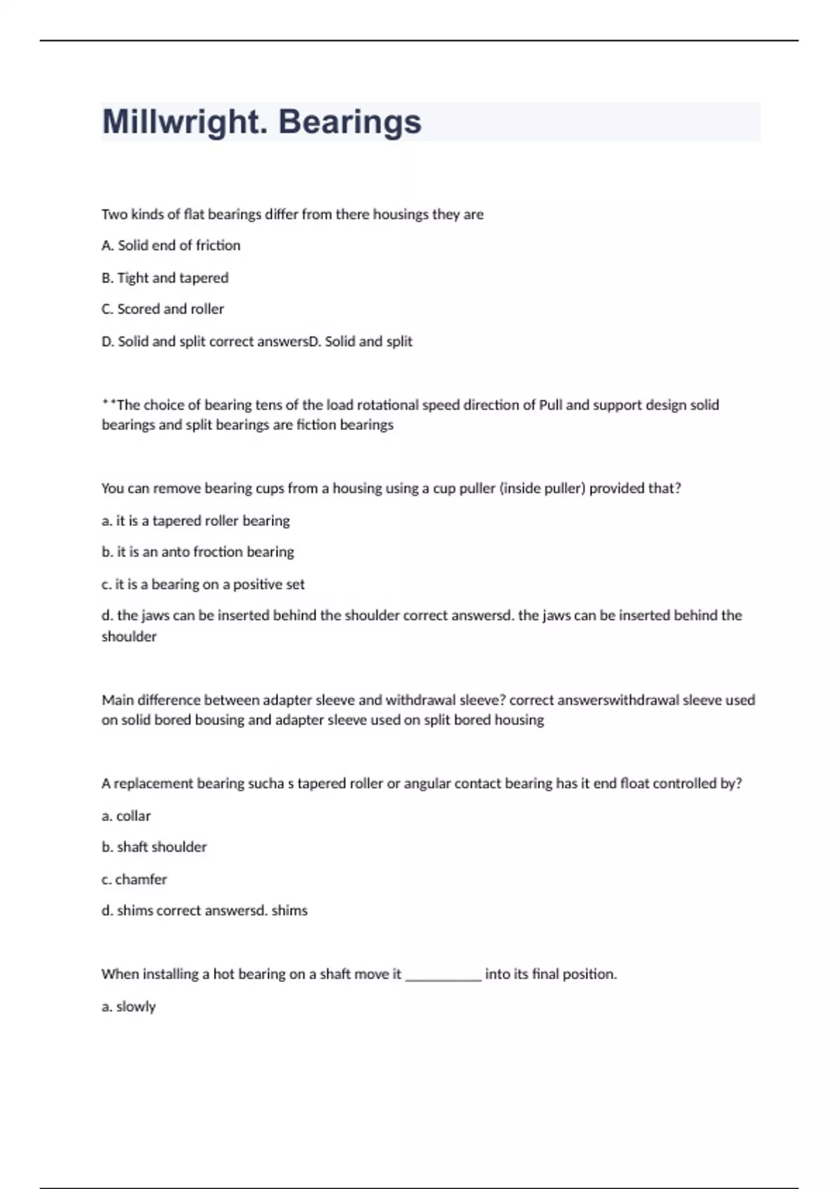 Two kinds of flat bearings differ from there housings they are A. Solid end of friction B. Tight and tapered C. Scored and roller D. Solid and split correct answersD. Solid and split **The choice of bearing tens of the load rotational speed direction of Pull and support design solid bearings and split bearings are fiction bearings You can remove bearing cups from a housing using a cup puller (inside puller) provided that? a. it is a tapered roller bearing b. it is an anto froction bearing c. it is a bearing on a positive set d. the jaws can be inserted behind the shoulder correct answersd. the jaws can be inserted behind the shoulder Main difference between adapter sleeve and withdrawal sleeve? correct answerswithdrawal sleeve used on solid bored bousing and adapter sleeve used on split bored housing A replacement bearing sucha s tapered roller or angular contact bearing has it end float controlled by? a. collar b. shaft shoulder c. chamfer d. shims correct answersd. shims When installing a hot bearing on a shaft move it __________ into its final position. a. slowly