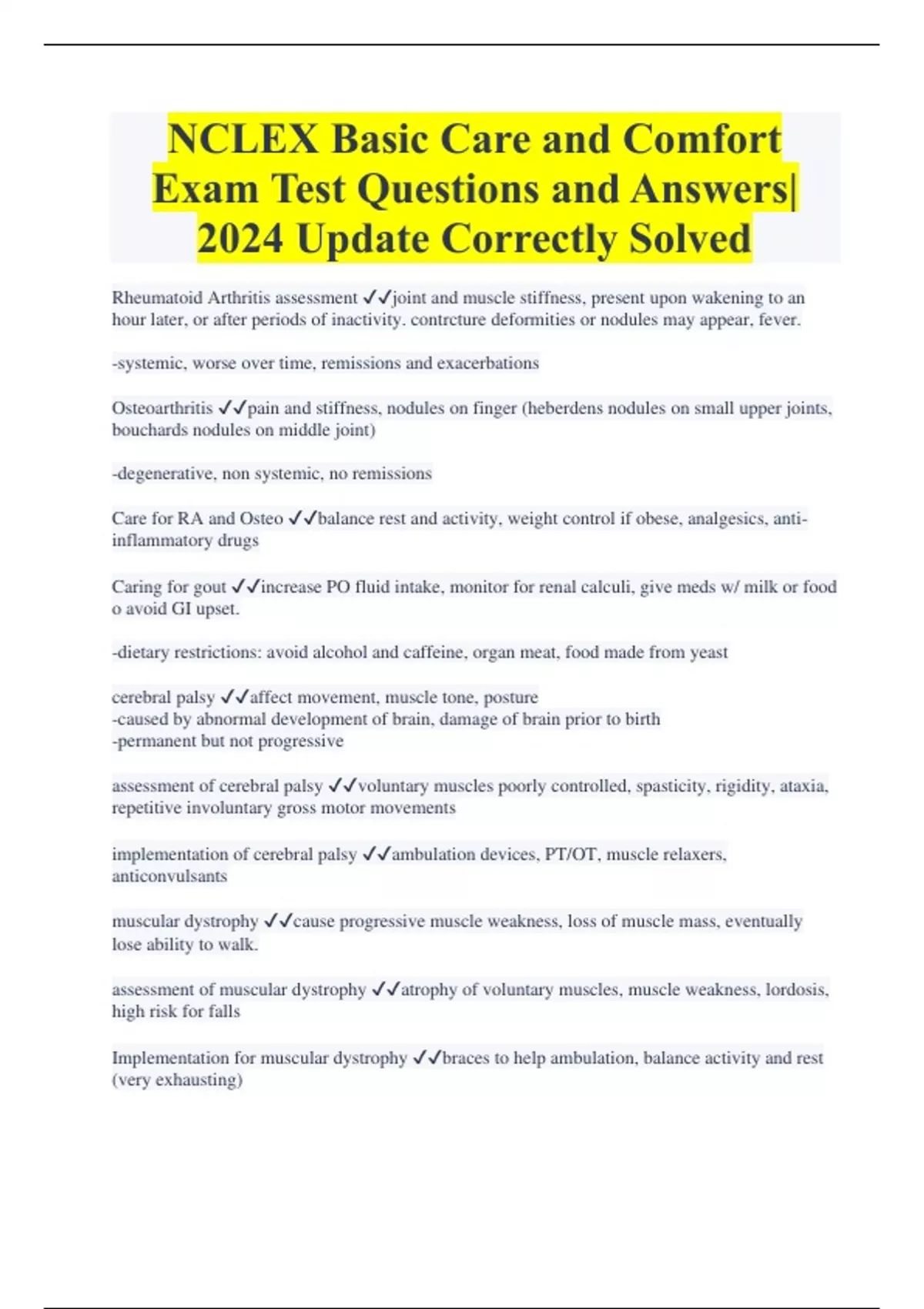 NCLEX Basic Care and Comfort Exam Test Questions and Answers| 2024 Update Correctly Solved Rheumatoid Arthritis assessment joint and muscle stiffness, present upon wakening to an hour later, or after periods of inactivity. contrcture deformities or nodules may appear, fever. -systemic, worse over time, remissions and exacerbations Osteoarthritis pain and stiffness, nodules on finger (heberdens nodules on small upper joints, bouchards nodules on middle joint) -degenerative, non systemic, no remissions Care for RA and Osteo balance rest and activity, weight control if obese, analgesics, antiinflammatory drugs Caring for gout increase PO fluid intake, monitor for renal calculi, give meds w/ milk or food o avoid GI upset. -dietary restrictions: avoid alcohol and caffeine, organ meat, food made from yeast cerebral palsy affect movement, muscle tone, posture -caused by abnormal development of brain, damage of brain prior to birth -permanent but not progressive assessment of cerebral palsy voluntary muscles poorly controlled, spasticity, rigidity, ataxia, repetitive involuntary gross motor movements implementation of cerebral palsy ambulation devices, PT/OT, muscle relaxers, anticonvulsants muscular dystrophy cause progressive muscle weakness, loss of muscle mass, eventually lose ability to walk.