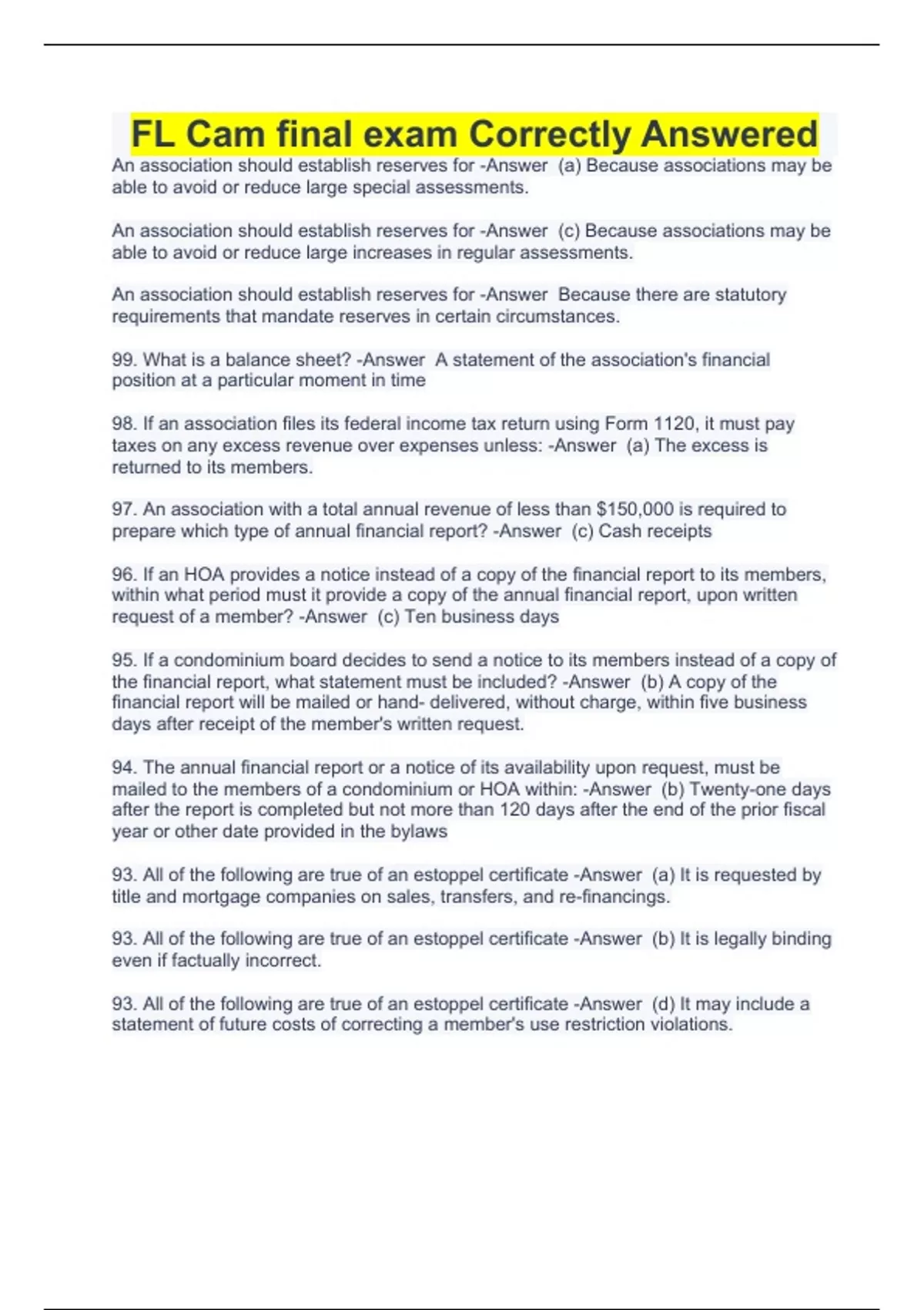 An association should establish reserves for -Answer (a) Because associations may be able to avoid or reduce large special assessments. An association should establish reserves for -Answer (c) Because associations may be able to avoid or reduce large increases in regular assessments. An association should establish reserves for -Answer Because there are statutory requirements that mandate reserves in certain circumstances. 99. What is a balance sheet? -Answer A statement of the association's financial position at a particular moment in time 98. If an association files its federal income tax return using Form 1120, it must pay taxes on any excess revenue over expenses unless: -Answer (a) The excess is returned to its members. 97. An association with a total annual revenue of less than $150,000 is required to prepare which type of annual financial report? -Answer (c) Cash receipts 96. If an HOA provides a notice instead of a copy of the financial report to its members, within what period must it provide a copy of the annual financial report, upon written request of a member? -Answer (c) Ten business days 95. If a condominium board decides to send a notice to its members instead of a copy of the financial report, what statement must be included? -Answer (b) A copy of the financial report will be mailed or hand- delivered, without charge, within five business days after receipt of the member's written request. 94. The annual financial report or a notice of its availability upon request, must be mailed to the members of a condominium or HOA within: -Answer (b) Twenty-one days after the report is completed but not more than 120 days after the end of the prior fiscal year or other date provided in the bylaws 93. All of the following are true of an estoppel certificate -Answer (a) It is requested by title and mortgage companies on sales, transfers, and re-financings. 93. All of the following are true of an estoppel certificate -Answer (b) It is legally binding even if factually incorrect. 93. All of the following are true of an estoppel certificate -Answer (d) It may include a statement of future costs of correcting a member's use restriction violations.