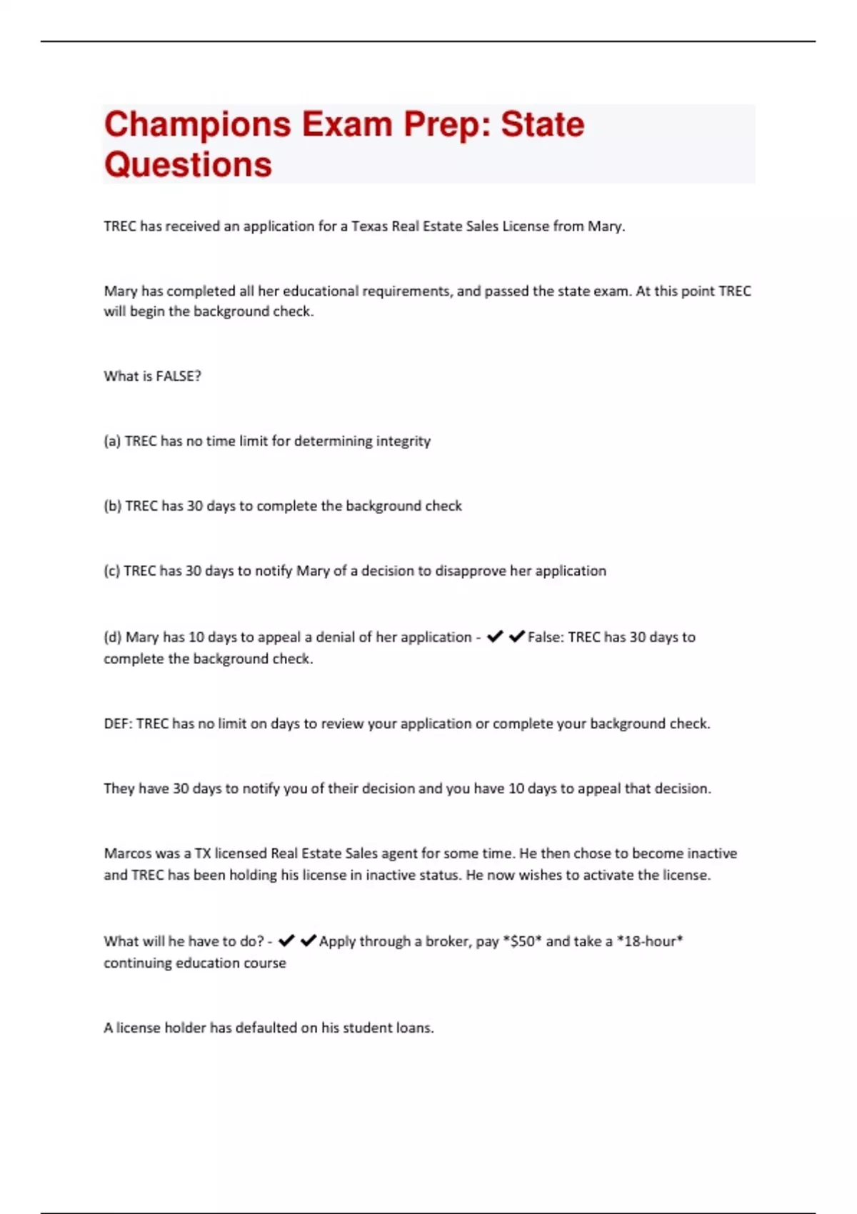 TREC has received an application for a Texas Real Estate Sales License from Mary. Mary has completed all her educational requirements, and passed the state exam. At this point TREC will begin the background check. What is FALSE? (a) TREC has no time limit for determining integrity (b) TREC has 30 days to complete the background check (c) TREC has 30 days to notify Mary of a decision to disapprove her application (d) Mary has 10 days to appeal a denial of her application - False: TREC has 30 days to complete the background check. DEF: TREC has no limit on days to review your application or complete your background check. They have 30 days to notify you of their decision and you have 10 days to appeal that decision. Marcos was a TX licensed Real Estate Sales agent for some time. He then chose to become inactive and TREC has been holding his license in inactive status. He now wishes to activate the license. What will he have to do? - Apply through a broker, pay *$50* and take a *18-hour* continuing education course A license holder has defaulted on his student loans.As a result of this TREC will? - *Refuse to renew the license*, unless and until, the loan payments are brought up to date. Does the IABS disclose agency or personal interest? - Agency Interest When a license holder markets his own property he should? - Inform the buyer that he is a license holder, and the owner of the property. DEF: Per TRELA you must always disclose self, spouse, parent or child is involved in a real estate transaction. The IABS discloses agency not personal interest. There is no TREC promulgated form solely intended for this disclosure although paragraph 4 of the TREC contracts are now used for this. Not mentioning your personal interest in a transaction is illegal. A Texas broker may pay a commission to? (a) A foreign broker who doesn't negotiate in Texas (b) A licensed attorney in Texas (c) An in-house employee of a principal (d) Any unlicensed person for a referral - A foreign broker who doesn't negotiate in Texas. DEF: Any licensed broker outside of Texas is considered a foreign broker and may be paid a referral fee out of your commission. Attorneys must also have a real estate license. In-house employees must have a license. Only licensed brokers in Texas can receive a real estate commission in Texas. Which of the following actions is NOT a violation of the TRELA?(a) A broker offers a guaranteed buy back of a property for a set price, if the purchaser is not happy with the investment after a two-year period of ownership (b) A broker guarantees a buyer that an investment property will appreciate over the next two years (c) Selling real estate by lottery (d) Placing a sign to sell or lease real property with only the verbal consent of the owner - Putting your money where your mouth is and signing a contract to purchase with a two year close date to buy it back yourself is legal.