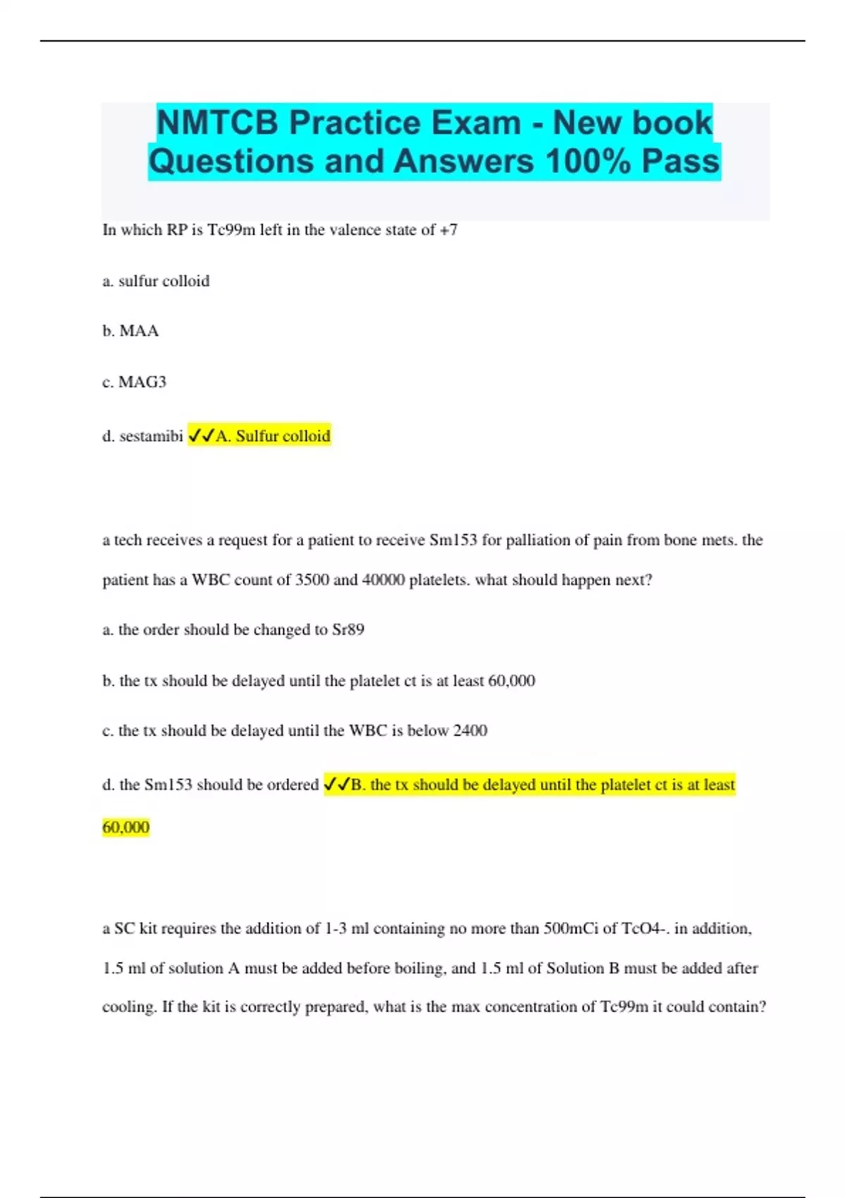 NMTCB Practice Exam - New book Questions and Answers 100% Pass In which RP is Tc99m left in the valence state of +7 a. sulfur colloid b. MAA c. MAG3 d. sestamibi A. Sulfur colloid a tech receives a request for a patient to receive Sm153 for palliation of pain from bone mets. the patient has a WBC count of 3500 and 40000 platelets. what should happen next? a. the order should be changed to Sr89 b. the tx should be delayed until the platelet ct is at least 60,000 c. the tx should be delayed until the WBC is below 2400 d. the Sm153 should be ordered B. the tx should be delayed until the platelet ct is at least 60,000 a SC kit requires the addition of 1-3 ml containing no more than 500mCi of TcO4-. in addition, 1.5 ml of solution A must be added before boiling, and 1.5 ml of Solution B must be added after cooling. If the kit is correctly prepared, what is the max concentration of Tc99m it could contain? a. 83 mCi/ml b. 125 mCi/ml c. 167 mCi/ml d. 500 mCi/ml B. 125 mCi/ml max. 1 ml TcO4- containing 500 mCi 500/(1.5+1.5+1) = 125 mCi/ml A hine-duley phantom is useful for testing the spatial resolution and spatial linearity with only one image. a. true b. false B. false the advantage of a lung ventilation scan performed with Xenon is a. the ability to match perfusion and vent positioning b. the ability to detect delayed washout c. the ability to perform the exam at the patient's bedside d. the ability to perform perfusion before ventilation without increasing the dose given for the vent study B. the ability to detect delayed washout A diphosphonate kit contian 180 mCi of Tc99m in 30 ml when it is prepared at 8am. Immediately, a 20 mCi dose is withdrawn for a bone scan. if the patient arrives late at 9:30 and half the volume is accidentally discharged, how much volume from the kit must now be added to the syringe to correct the dose to 20 mCi? (no other doses have been withdrawn meanwhile, and the decay factor for 1.5 hrs is 0.841) a. 1.5 ml b. 2.0 ml c. 2.3 ml d. 2.5 ml e. 2.7 ml C. 2.3 mL lots of math, sorry :( a WBS bone scan film shows a good posterior image, but the anterior view appears diffuse with greater soft tissue activity. what is the probable cause? a. wrong collimator used for anterior b. increased patient to detector distance on the ant relative to the post c. low tagging efficiency of the RP d. patient was not sufficiently hydrated e.