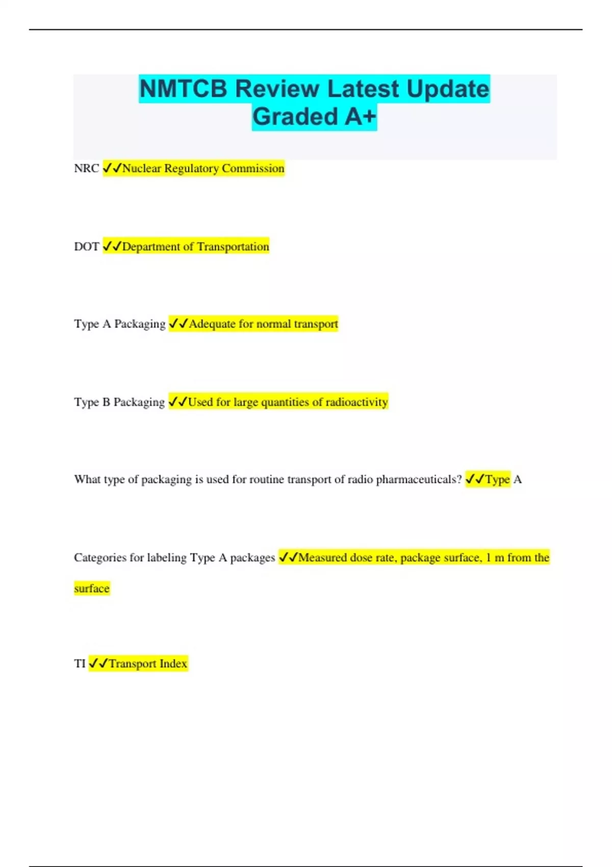 NMTCB Review Latest Update Graded A+ NRC Nuclear Regulatory Commission DOT Department of Transportation Type A Packaging Adequate for normal transport Type B Packaging Used for large quantities of radioactivity What type of packaging is used for routine transport of radio pharmaceuticals? Type A Categories for labeling Type A packages Measured dose rate, package surface, 1 m from the surface TI Transport Index Transport index Dose rate measured at 1 m from the surface DOT 1 (white) -No more than 0.5 mR/h at surface -NDR at 1 m DOT 2 (yellow) -No more than 50 mR/h at surface -No more than 1 mR/h at 1 m DOT 3 (yellow) -No more than 200 mR/h at surface -No more than 10 mR/h at 1 m FDA Food and Drug Administration IND Investigational New Drug What does a radio pharmaceutical need to be distribute for sale? NDA NDA New Drug Authorization A drug under investigation for future approval IND 3 factors in reducing external radiation exposure Time, distance, shielding Total dose= (Dose rate)(Time) Inverse square law= (I1)(D1)^2=(I2)(D2)^2 Shielding for alpha particles Sheet of paper Shielding for beta particles Plastic or lucite Why should lead shielding not be used for beta emitters? Creates bremmstrahlung Bremsstrahlung Radiation resulting from deceleration of beta particles as they approach the nuclei of the lead atoms-released as x rays HVL Half value layer The amount of bremsstrahlung _____________ with the density of the material that the beta particles pass Increases Half value layer The thickness of a material required to reduce the radiation intensity to half its original value Energy of positron emitters 511 keV When are film badges affective? When measuring radiation exposures of 10 mrem to several hundred rem What is a film badge made of? 3 or 4 filters of different material (lead, copper, aluminum, plastic) TLD