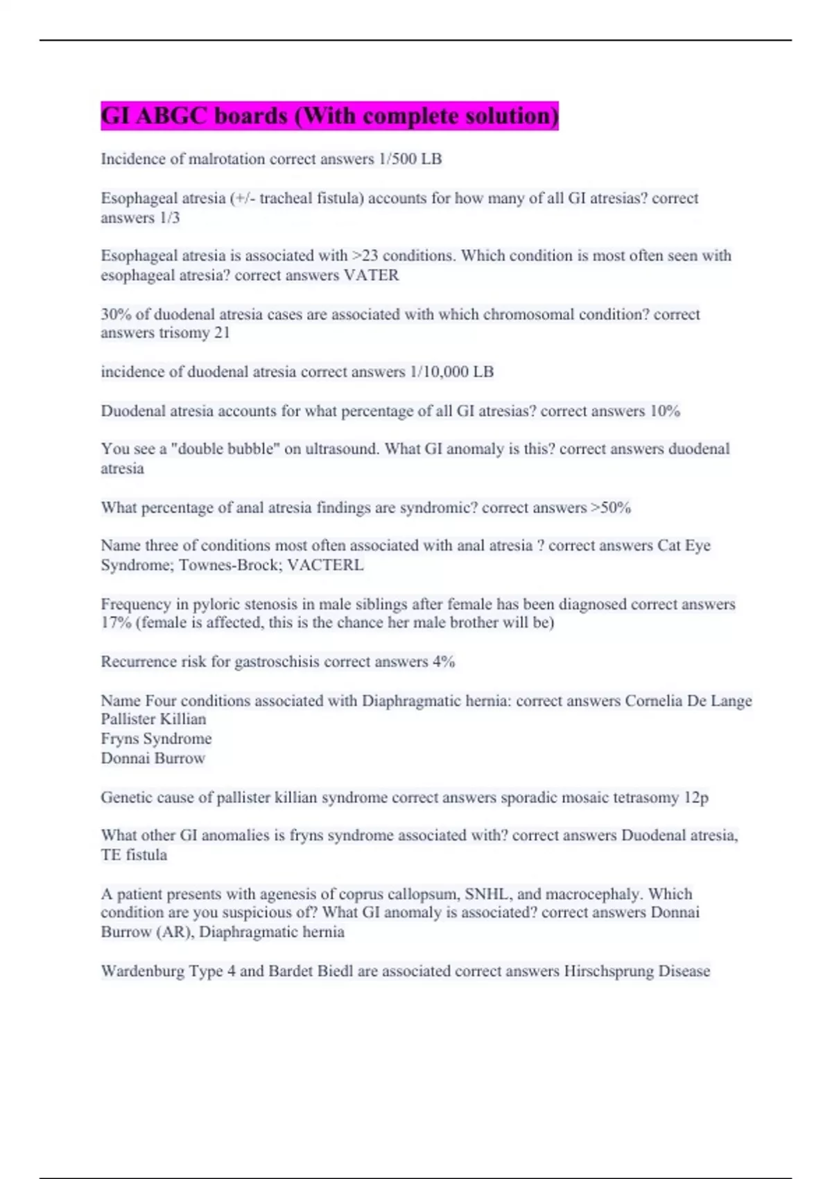 Incidence of malrotation correct answers 1/500 LB Esophageal atresia (+/- tracheal fistula) accounts for how many of all GI atresias? correct answers 1/3 Esophageal atresia is associated with >23 conditions. Which condition is most often seen with esophageal atresia? correct answers VATER 30% of duodenal atresia cases are associated with which chromosomal condition? correct answers trisomy 21 incidence of duodenal atresia correct answers 1/10,000 LB Duodenal atresia accounts for what percentage of all GI atresias? correct answers 10% You see a "double bubble" on ultrasound. What GI anomaly is this? correct answers duodenal atresia What percentage of anal atresia findings are syndromic? correct answers >50% Name three of conditions most often associated with anal atresia ? correct answers Cat Eye Syndrome; Townes-Brock; VACTERL Frequency in pyloric stenosis in male siblings after female has been diagnosed correct answers 17% (female is affected, this is the chance her male brother will be) Recurrence risk for gastroschisis correct answers 4% Name Four conditions associated with Diaphragmatic hernia: correct answers Cornelia De Lange Pallister Killian Fryns Syndrome Donnai Burrow Genetic cause of pallister killian syndrome correct answers sporadic mosaic tetrasomy 12p What other GI anomalies is fryns syndrome associated with? correct answers Duodenal atresia, TE fistula A patient presents with agenesis of coprus callopsum, SNHL, and macrocephaly. Which condition are you suspicious of? What GI anomaly is associated? correct answers Donnai Burrow (AR), Diaphragmatic hernia Wardenburg Type 4 and Bardet Biedl are associated correct answers Hirschsprung Disease