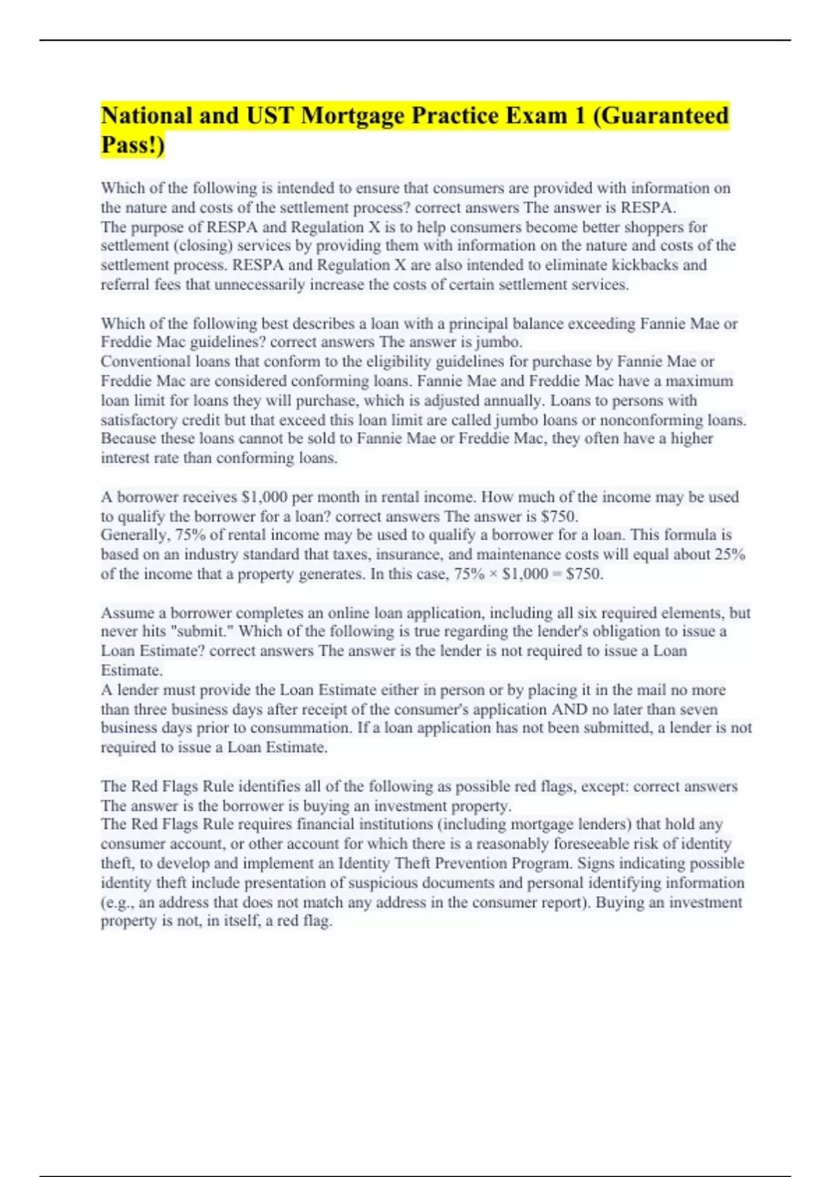 Which of the following is intended to ensure that consumers are provided with information on the nature and costs of the settlement process? correct answers The answer is RESPA. The purpose of RESPA and Regulation X is to help consumers become better shoppers for settlement (closing) services by providing them with information on the nature and costs of the settlement process. RESPA and Regulation X are also intended to eliminate kickbacks and referral fees that unnecessarily increase the costs of certain settlement services. Which of the following best describes a loan with a principal balance exceeding Fannie Mae or Freddie Mac guidelines? correct answers The answer is jumbo. Conventional loans that conform to the eligibility guidelines for purchase by Fannie Mae or Freddie Mac are considered conforming loans. Fannie Mae and Freddie Mac have a maximum loan limit for loans they will purchase, which is adjusted annually. Loans to persons with satisfactory credit but that exceed this loan limit are called jumbo loans or nonconforming loans. Because these loans cannot be sold to Fannie Mae or Freddie Mac, they often have a higher interest rate than conforming loans. A borrower receives $1,000 per month in rental income. How much of the income may be used to qualify the borrower for a loan? correct answers The answer is $750. Generally, 75% of rental income may be used to qualify a borrower for a loan. This formula is based on an industry standard that taxes, insurance, and maintenance costs will equal about 25% of the income that a property generates. In this case, 75% × $1,000 = $750. Assume a borrower completes an online loan application, including all six required elements, but never hits "submit." Which of the following is true regarding the lender's obligation to issue a Loan Estimate? correct answers The answer is the lender is not required to issue a Loan Estimate. A lender must provide the Loan Estimate either in person or by placing it in the mail no more than three business days after receipt of the consumer's application AND no later than seven business days prior to consummation. If a loan application has not been submitted, a lender is not required to issue a Loan Estimate. The Red Flags Rule identifies all of the following as possible red flags, except: correct answers The answer is the borrower is buying an investment property. The Red Flags Rule requires financial institutions (including mortgage lenders) that hold any consumer account, or other account for which there is a reasonably foreseeable risk of identity theft, to develop and implement an Identity Theft Prevention Program. Signs indicating possible identity theft include presentation of suspicious documents and personal identifying information (e.g., an address that does not match any address in the consumer report). Buying an investment property is not, in itself, a red flag.