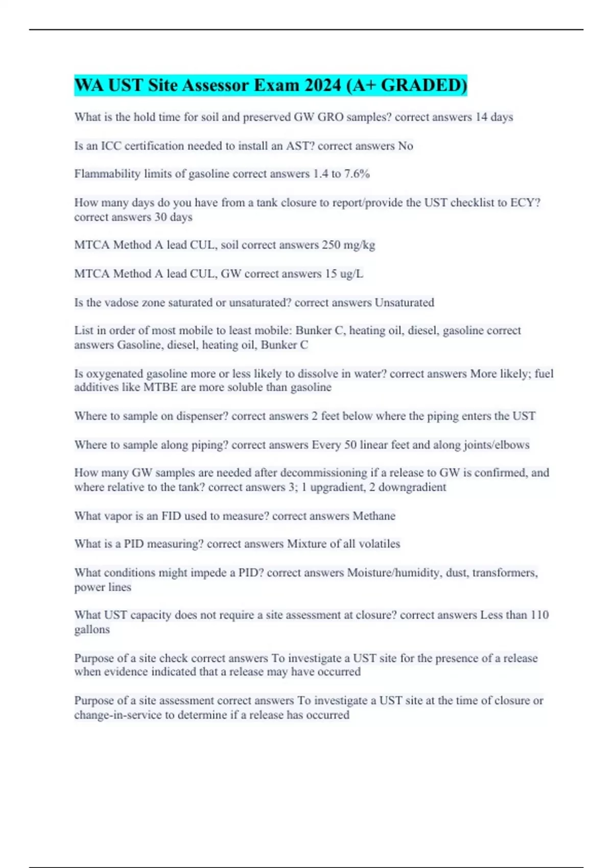 What is the hold time for soil and preserved GW GRO samples? correct answers 14 days Is an ICC certification needed to install an AST? correct answers No Flammability limits of gasoline correct answers 1.4 to 7.6% How many days do you have from a tank closure to report/provide the UST checklist to ECY? correct answers 30 days MTCA Method A lead CUL, soil correct answers 250 mg/kg MTCA Method A lead CUL, GW correct answers 15 ug/L Is the vadose zone saturated or unsaturated? correct answers Unsaturated List in order of most mobile to least mobile: Bunker C, heating oil, diesel, gasoline correct answers Gasoline, diesel, heating oil, Bunker C Is oxygenated gasoline more or less likely to dissolve in water? correct answers More likely; fuel additives like MTBE are more soluble than gasoline Where to sample on dispenser? correct answers 2 feet below where the piping enters the UST Where to sample along piping? correct answers Every 50 linear feet and along joints/elbows How many GW samples are needed after decommissioning if a release to GW is confirmed, and where relative to the tank? correct answers 3; 1 upgradient, 2 downgradient What vapor is an FID used to measure? correct answers Methane What is a PID measuring? correct answers Mixture of all volatiles What conditions might impede a PID? correct answers Moisture/humidity, dust, transformers, power lines What UST capacity does not require a site assessment at closure? correct answers Less than 110 gallons Purpose of a site check correct answers To investigate a UST site for the presence of a release when evidence indicated that a release may have occurred Purpose of a site assessment correct answers To investigate a UST site at the time of closure or change-in-service to determine if a release has occurred