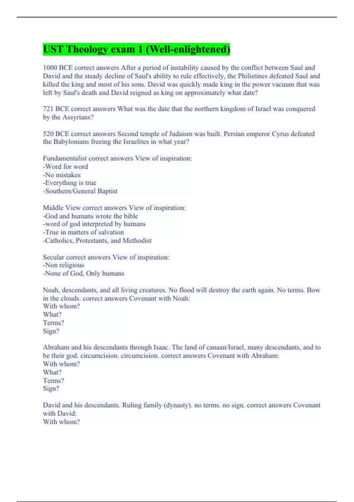 1000 BCE correct answers After a period of instability caused by the conflict between Saul and David and the steady decline of Saul's ability to rule effectively, the Philistines defeated Saul and killed the king and most of his sons. David was quickly made king in the power vacuum that was left by Saul's death and David reigned as king on approximately what date? 721 BCE correct answers What was the date that the northern kingdom of Israel was conquered by the Assyrians? 520 BCE correct answers Second temple of Judaism was built. Persian emperor Cyrus defeated the Babylonians freeing the Israelites in what year? Fundamentalist correct answers View of inspiration: -Word for word -No mistakes -Everything is true -Southern/General Baptist Middle View correct answers View of inspiration: -God and humans wrote the bible -word of god interpreted by humans -True in matters of salvation -Catholics, Protestants, and Methodist Secular correct answers View of inspiration: -Non religious -None of God, Only humans Noah, descendants, and all living creatures. No flood will destroy the earth again. No terms. Bow in the clouds. correct answers Covenant with Noah: With whom? What? Terms? Sign? Abraham and his descendants through Isaac. The land of canaan/Israel, many descendants, and to be their god. circumcision. circumcision. correct answers Covenant with Abraham: With whom? What? Terms? Sign? David and his descendants. Ruling family (dynasty). no terms. no sign. correct answers Covenant with David: With whom?