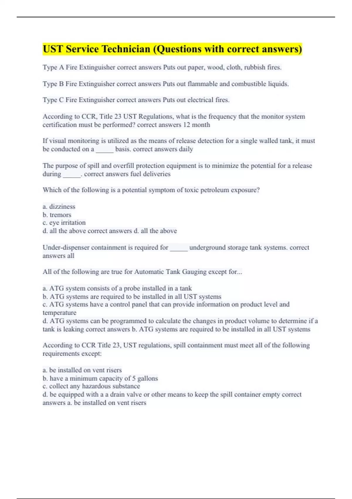 Type A Fire Extinguisher correct answers Puts out paper, wood, cloth, rubbish fires. Type B Fire Extinguisher correct answers Puts out flammable and combustible liquids. Type C Fire Extinguisher correct answers Puts out electrical fires. According to CCR, Title 23 UST Regulations, what is the frequency that the monitor system certification must be performed? correct answers 12 month If visual monitoring is utilized as the means of release detection for a single walled tank, it must be conducted on a _____ basis. correct answers daily The purpose of spill and overfill protection equipment is to minimize the potential for a release during _____. correct answers fuel deliveries Which of the following is a potential symptom of toxic petroleum exposure? a. dizziness b. tremors c. eye irritation d. all the above correct answers d. all the above Under-dispenser containment is required for _____ underground storage tank systems. correct answers all All of the following are true for Automatic Tank Gauging except for... a. ATG system consists of a probe installed in a tank b. ATG systems are required to be installed in all UST systems c. ATG systems have a control panel that can provide information on product level and temperature d. ATG systems can be programmed to calculate the changes in product volume to determine if a tank is leaking correct answers b. ATG systems are required to be installed in all UST systems According to CCR Title 23, UST regulations, spill containment must meet all of the following requirements except: a. be installed on vent risers b. have a minimum capacity of 5 gallons c. collect any hazardous substance d. be equipped with a a drain valve or other means to keep the spill container empty correct answers a. be installed on vent risers