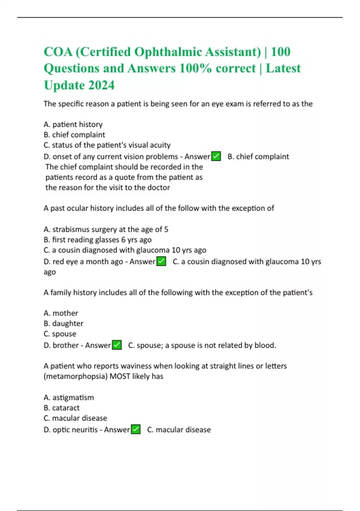 COA (Certified Ophthalmic Assistant) | 100 Questions and Answers 100% correct | Latest Update 2024