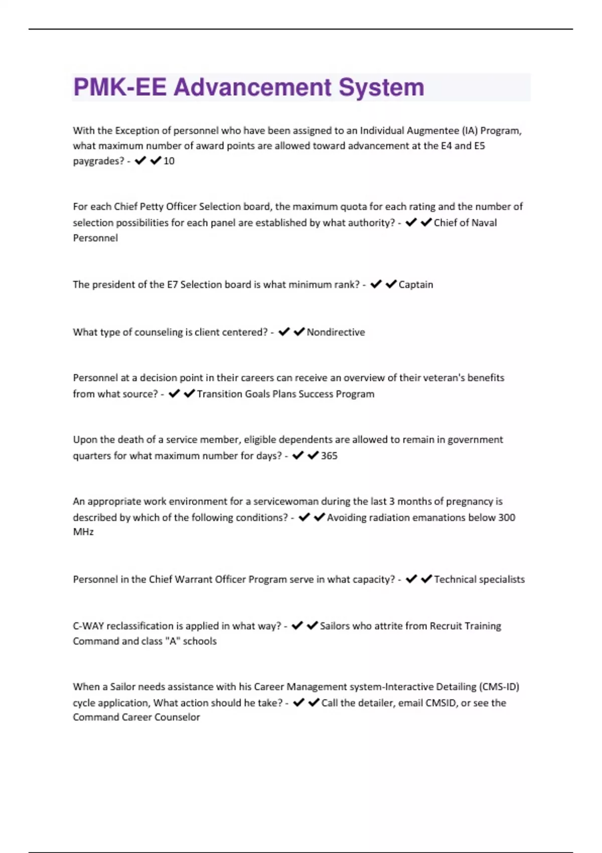With the Exception of personnel who have been assigned to an Individual Augmentee (IA) Program, what maximum number of award points are allowed toward advancement at the E4 and E5 paygrades? - 10 For each Chief Petty Officer Selection board, the maximum quota for each rating and the number of selection possibilities for each panel are established by what authority? - Chief of Naval Personnel The president of the E7 Selection board is what minimum rank? - Captain What type of counseling is client centered? - Nondirective Personnel at a decision point in their careers can receive an overview of their veteran's benefits from what source? - Transition Goals Plans Success Program Upon the death of a service member, eligible dependents are allowed to remain in government quarters for what maximum number for days? - 365 An appropriate work environment for a servicewoman during the last 3 months of pregnancy is described by which of the following conditions? - Avoiding radiation emanations below 300 MHz Personnel in the Chief Warrant Officer Program serve in what capacity? - Technical specialists C-WAY reclassification is applied in what way? - Sailors who attrite from Recruit Training Command and class "A" schools When a Sailor needs assistance with his Career Management system-Interactive Detailing (CMS-ID) cycle application, What action should he take? - Call the detailer, email CMSID, or see the Command Career CounselorAn RE-3 Reenlistment code will have what effect, if any, on a Sailor's veteran's benefits? - None One of your Sailors asks you about the Thrift Savings Plan Investment funds. you should refer him to which of the following locations? - Thrift Saving Plan website A Sailor may be deprived of liberty by which of the following authorities? - Commanding Officer or Officer in Charge only Which of the following reason is justification to extend a Sailor's working hours? - To complete work that should have been done earlier Fraudulent enlistment is covered under what Uniform Code of Military Justice article? - 83 Within a Sailor's Enlisted Official Military Personnel File (OMPF), what field codes are provided to the selection board? - 30 through 38