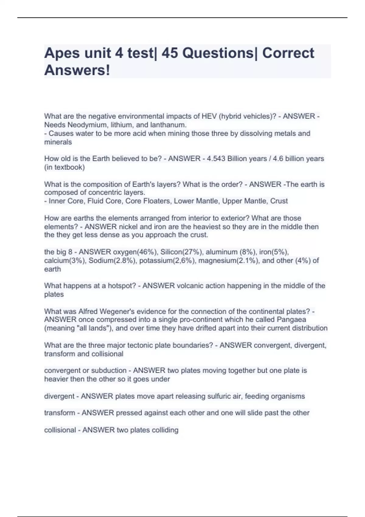 Apes unit 4 test| 45 Questions| CorrWhat are the negative environmental impacts of HEV (hybrid vehicles)? - ANSWER -Needs Neodymium, lithium, and lanthanum. - Causes water to be more acid when mining those three by dissolving metals and minerals How old is the Earth believed to be? - ANSWER - 4.543 Billion years / 4.6 billion years (in textbook) What is the composition of Earth's layers? What is the order? - ANSWER -The earth is composed of concentric layers. - Inner Core, Fluid Core, Core Floaters, Lower Mantle, Upper Mantle, Crust How are earths the elements arranged from interior to exterior? What are those elements? - ANSWER nickel and iron are the heaviest so they are in the middle then the they get less dense as you approach the crust. the big 8 - ANSWER oxygen(46%), Silicon(27%), aluminum (8%), iron(5%), calcium(3%), Sodium(2.8%), potassium(2,6%), magnesium(2.1%), and other (4%) of earth What happens at a hotspot? - ANSWER volcanic action happening in the middle of the plates What was Alfred Wegener's evidence for the connection of the continental plates? - ANSWER once compressed into a single pro-continent which he called Pangaea (meaning "all lands"), and over time they have drifted apart into their current distribution What are the three major tectonic plate boundaries? - ANSWER convergent, divergent, transform and collisional convergent or subduction - ANSWER two plates moving together but one plate is he ect Answers!