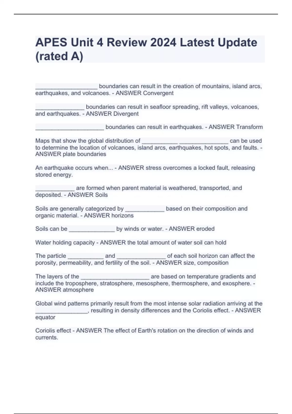 APES Unit 4 Review ___________________ boundaries can result in the creation of mountains, island arcs, earthquakes, and volcanoes. - ANSWER Convergent _______________ boundaries can result in seafloor spreading, rift valleys, volcanoes, and earthquakes. - ANSWER Divergent _____________________ boundaries can result in earthquakes. - ANSWER Transform Maps that show the global distribution of ___________ _______________ can be used to determine the location of volcanoes, island arcs, earthquakes, hot spots, and faults. - ANSWER plate boundaries An earthquake occurs when... - ANSWER stress overcomes a locked fault, releasing stored energy. ____________ are formed when parent material is weathered, transported, and deposited. - ANSWER Soils 2024 Latest Update (rated A)