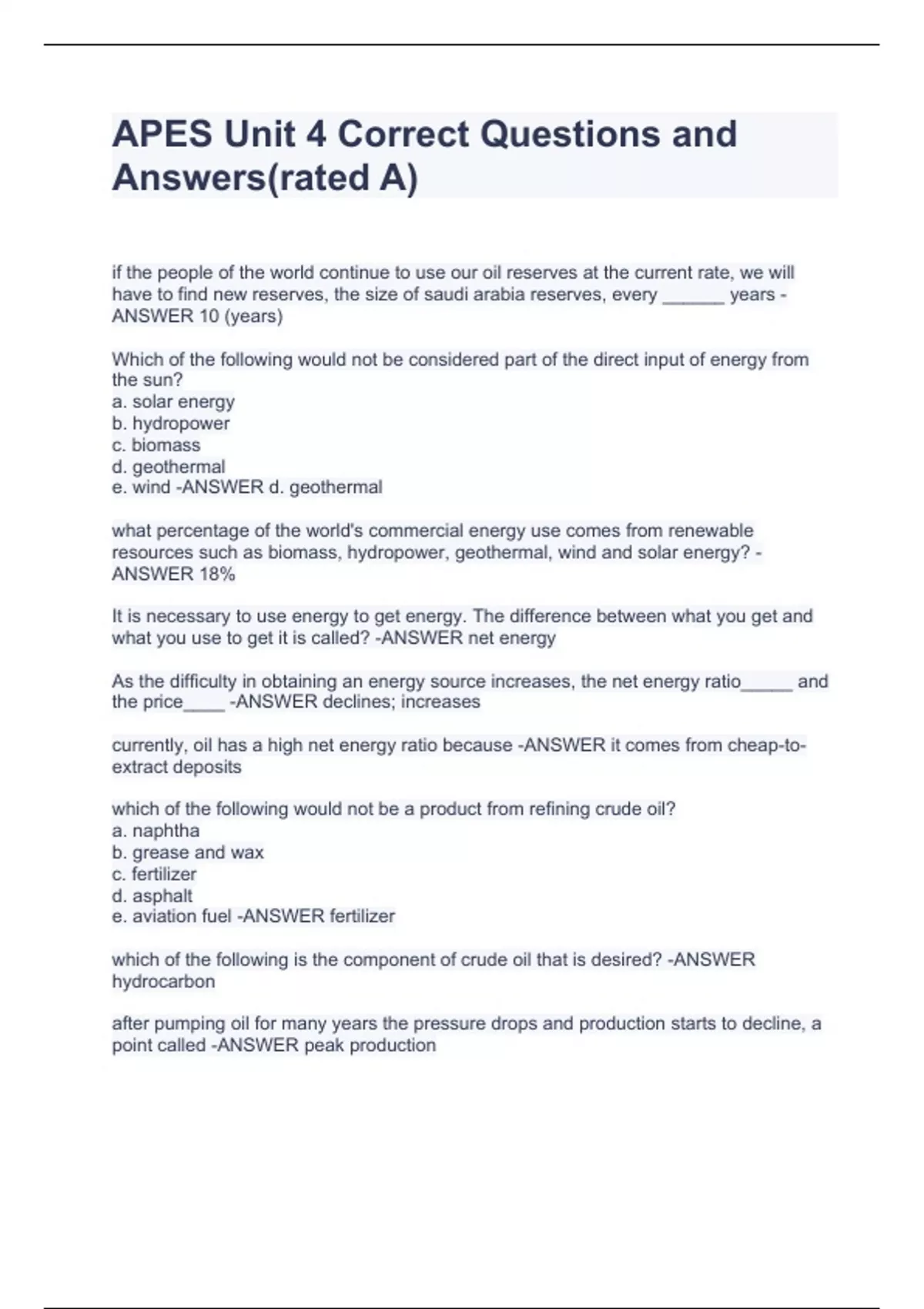 APES Unit 4 Correct Questions and Answer if the people of the world continue to use our oil reserves at the current rate, we will have to find new reserves, the size of saudi arabia reserves, every ______ years -ANSWER 10 (years) Which of the following would not be considered part of the direct input of energy from the sun? a. solar energy b. hydropower c. biomass d. geothermal e. wind -ANSWER d. geothermal what percentage of the world's commercial energy use comes from renewable resources such as biomass, hydropower, geothermal, wind and solar energy? -ANSWER 18% It is necessary to use energy to get energy. The difference between what you get and what you use to get it is called? -ANSWER net energy As the difficulty in obtaining an energy source increases, the net energy ratio_____ and the price____ -ANSWER declines; increases currently, oil has a high net energy ratio because -ANSWER it comes from cheap-to-extract deposits which of the following would not be a product from refining crude oil? a. naphtha b. grease and wax c. fertilizer d s(rated A)