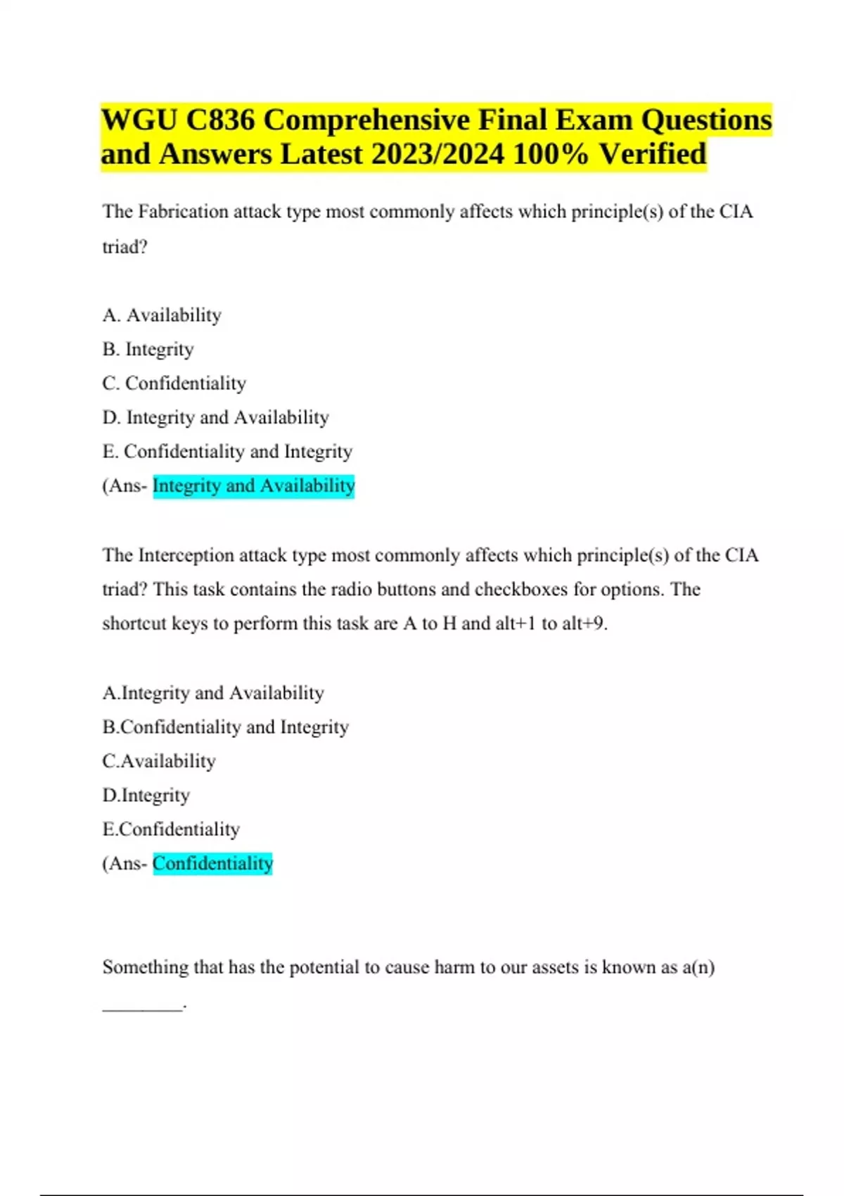 WGU C836 Final Exam Questions With Correct Answers Latest 2024 (100% Verified) The Fabrication attack type most commonly affects which principle(s) of the CIA triad? A. Availability B. Integrity C. Confidentiality D. Integrity and Availability E. Confidentiality and Integrity (Ans- Integrity and Availability The Interception attack type most commonly affects which principle(s) of the CIA triad? This task contains the radio buttons and checkboxes for options. The shortcut keys to perform this task are A to H and alt+1 to alt+9. A.Integrity and Availability B.Confidentiality and Integrity C.Availability D.Integrity E.Confidentiality (Ans- Confidentiality Something that has the potential to cause harm to our assets is known as a(n) ________. WGU C836 Comprehensive Final Exam Questions and Answers Latest 2023/2024 100% Verified A.Threat B.Impact C.Risk D.Vulnerability (Ans- Threat Controls that protect the systems, networks, and environments that process, transmit, and store our data are called _______. A.Logical controls B.Administrative controls C.Physical controls (Ans- Logical Control What is the first and arguably one of the most important steps of the risk management process? A.Assess risks B.Mitigate risks C.Identify threats D.Assess vulnerabilities E.Identify assets (Ans- Identify assets The biometric characteristic that measures how well a factor resists change over time and with advancing age is called __________. A. Collectability B. Acceptability C.Universality D.Uniqueness E.Permanence (Ans- E.Permanence What type of authentication can prevent a man-in-the-middle attack? This task contains the radio buttons and checkboxes for options. A.Multifactor B.Mutual C.Something you know D.Something you are ESomething you do (Ans- B.Mutual A user who creates a network share and sets permissions on that share is employing which model of access control? This task contains the radio buttons and checkboxes for options. The shortcut keys to perform this task are A to H and alt+1 to alt+9. A. Mandatory access control B. Discretionary access control C. Attribute-based access control D. Role-based access control (Ans- Discretionary access control What type of access control can prevent the confused deputy problem? This task contains the radio buttons and checkboxes for options. The shortcut keys to perform this task are A to H and alt+1 to alt+9. A.ACLs B.A password policy C.Capability-based security D.A locked door (Ans- Capability-based security Confidential Services Inc. is a military-support branch consisting of 1,400 computers with Internet access and 250 servers. All employees are required to have security clearances. From the options listed below, what access control model would be most appropriate for this organization? This task contains the radio buttons and checkboxes for options. The shortcut keys to perform this task are A to H and alt+1 to alt+9. A.Discretionary access control B.Role-based access control C.Attribute-based access control D.Mandatory access control (Ans- D.Mandatory access control A VPN connection that is set to time out after 24 hours is demonstrating which model of access control? This task contains the radio buttons and checkboxes for options. The shortcut keys to perform this task are A to H and alt+1 to alt+9. A.Mandatory access control B.Role-based access control C.Attribute-based access control D.Discretionary access control (Ans- Attribute-based access control Lesson: Authorization and Access Control Objective: More Advanced What process ensures compliance with applicable laws, policies, and other bodies of administrative control, and detects misuse? This task contains the radio buttons and checkboxes for options. The shortcut keys to perform this task are A to H and alt+1 to alt+9. A.Nonrepudiation B.Deterrence C.Auditing D.Accountability E.Authorization (Ans- C.Auditing Lesson: Auditing and Accountability Objective: Introduction Nessus is an example of a(n) _______________ tool. This task contains the radio buttons and checkboxes for options. The shortcut keys to perform this task are A to H and alt+1 to alt+9. A.Fuzzing B.Anti-virus C.Anti-malware D.Vulnerability scanning E.Penetration testing (Ans- D.Vulnerability scanning A surveillance video log contains a record, including the exact date and time, of an individual gaining access to his company's office building after hours. He denies that he was there during that time, but the existence of the video log proves otherwise. What benefit of accountability does this example demonstrate? This task contains the radio buttons and checkboxes for options. The shortcut keys to perform this task are A to H and alt+1 to alt+9. A.Deterrence B.Nonrepudiation C.Intrusion detection and prevention D.Authentication E.Authorization (Ans- B.Nonrepudiation _______ provides us with the means to trace activities in our environment back to their source. This task contains the radio buttons and checkboxes for options. The shortcut keys to perform this task are A to H and alt+1 to alt+9. A.Access B.Authentication C.Accountability D.Authorization E.Nonrepudiation (Ans- C.Accountability Backordered Parts is a defense contractor that builds communications parts for the military. The employees use mostly Web-based applications for parts design and information sharing. Due to the sensitive nature of the business, Backordered Parts would like to implement a solution that secures all browser connections to the Web servers. What encryption solution best meets this company's needs? This task contains the radio buttons and checkboxes for options.