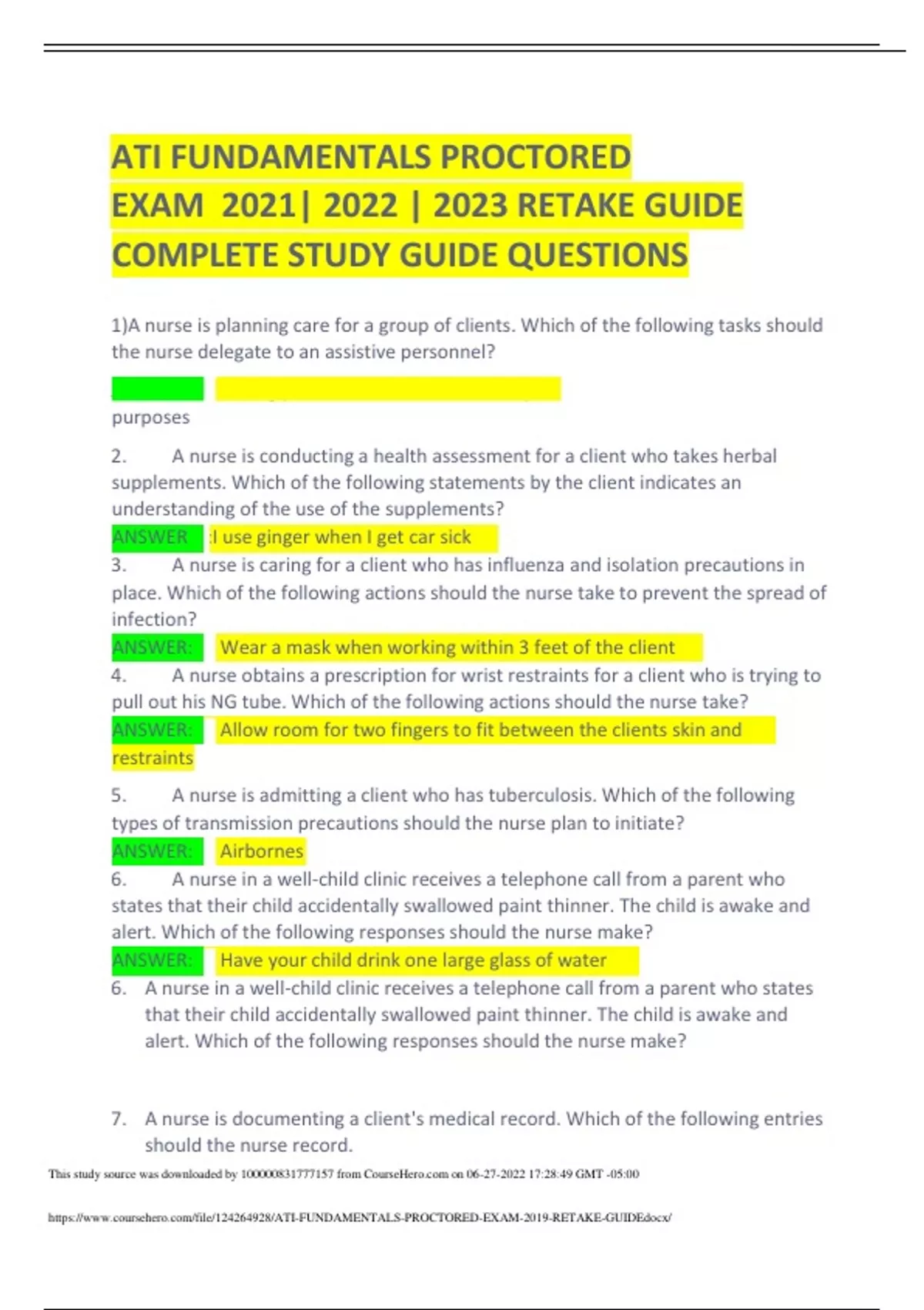 ATI FUNDAMENTALS PROCTORED EXAM 2021| 2022 | 2023 RETAKE GUIDE COMPLETE STUDY GUIDE QUESTIONS 1)A nurse is planning care for a group of clients. Which of the following tasks should the nurse delegate to an assistive personnel? ANSWER: Providing postmortem care to a client,postmortem care serves several purposes 2. A nurse is conducting a health assessment for a client who takes herbal supplements. Which of the following statements by the client indicates an understanding of the use of the supplements? ANSWER :I use ginger when I get car sick