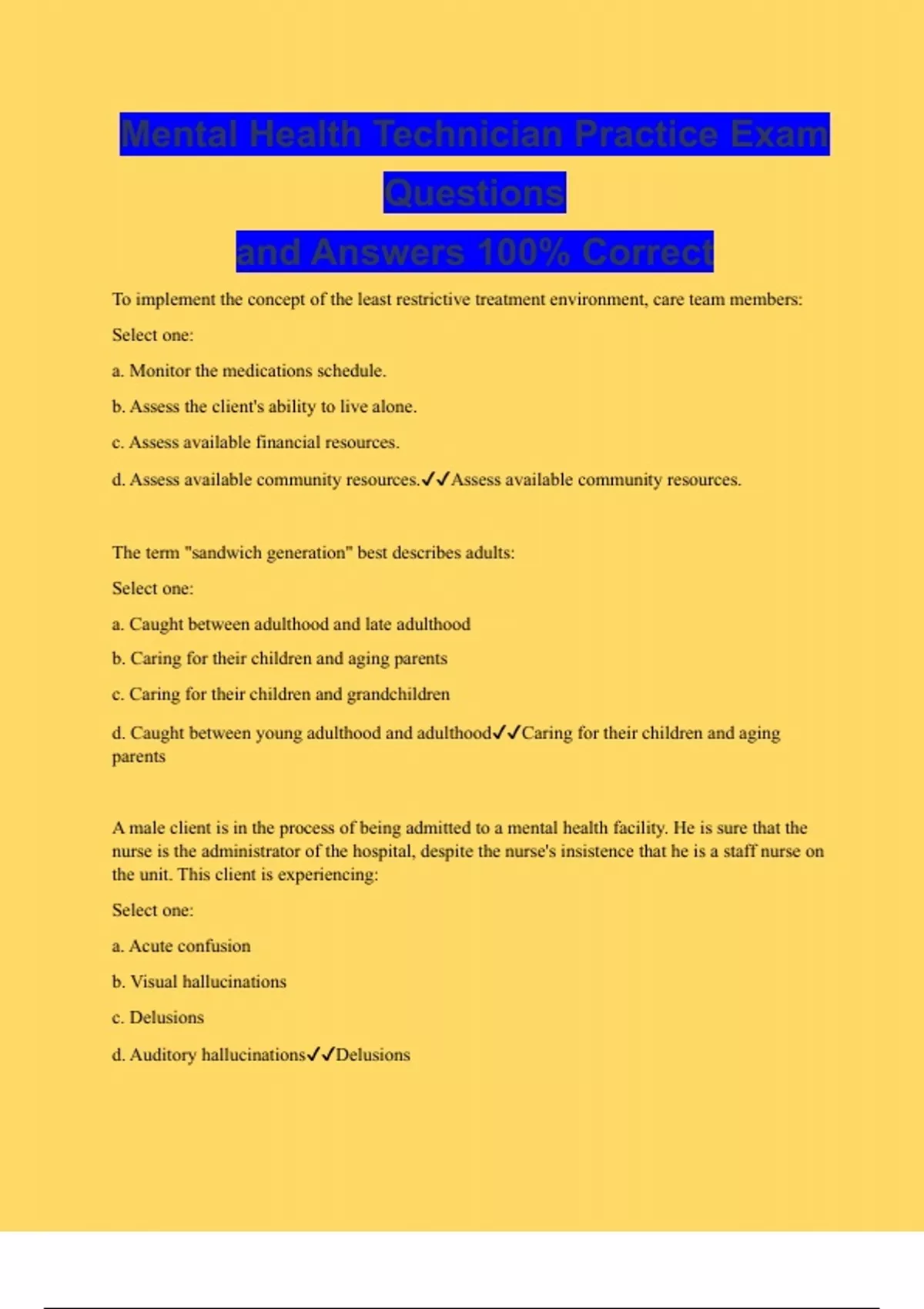 Mental Health Technician Practice Exam Questions and Answers 100% Correct
