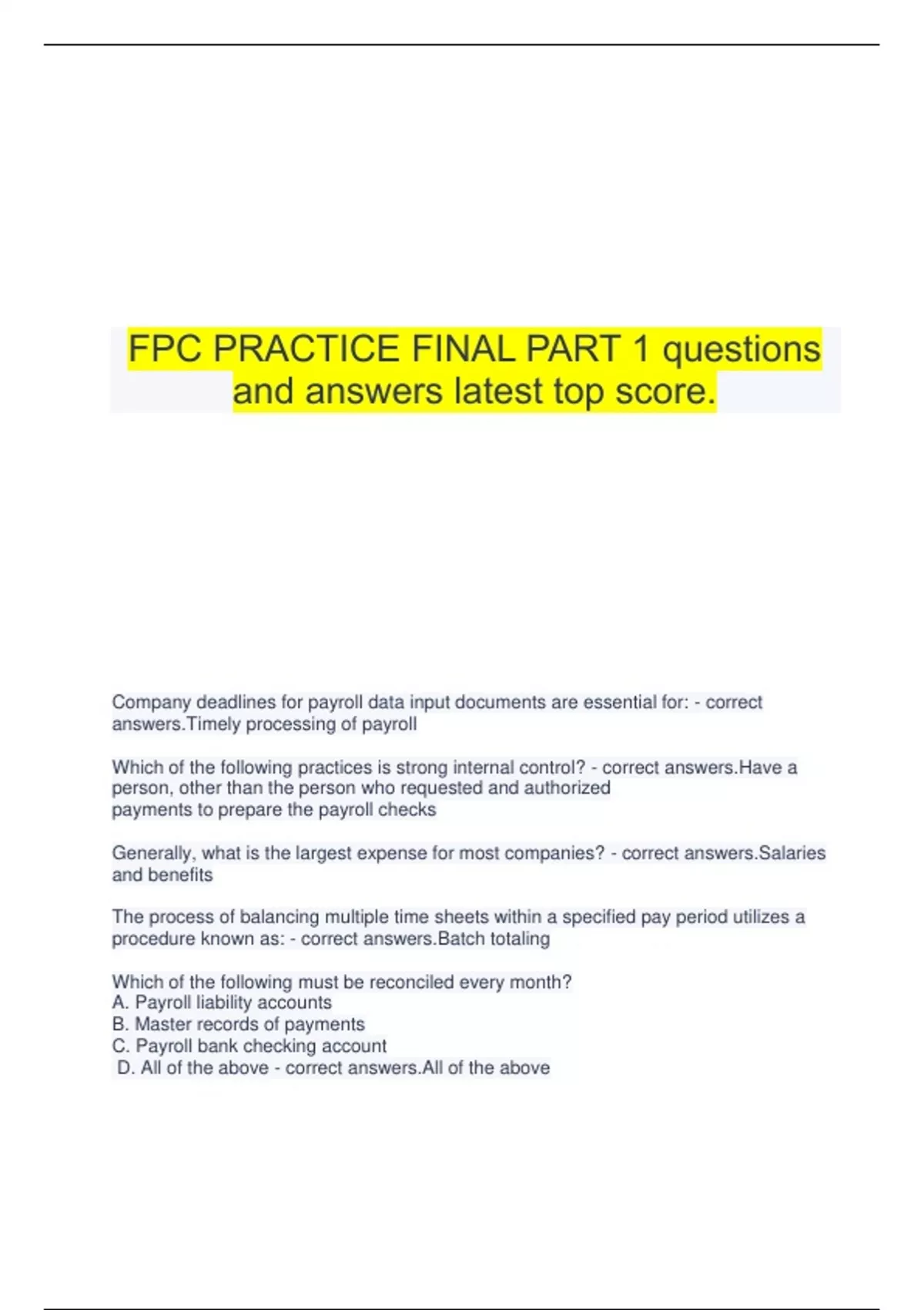 FPC PRACTICE FINAL PART 1 questions and answers latest top score. Company deadlines for payroll data input documents are essential for: - correct answers.Timely processing of payroll Which of the following practices is strong internal control? - correct answers.Have a person, other than the person who requested and authorized payments to prepare the payroll checks Generally, what is the largest expense for most companies? - correct answers.Salaries and benefits The process of balancing multiple time sheets within a specified pay period utilizes a procedure known as: - correct answers.Batch totaling Which of the following must be reconciled every month? A. Payroll liability accounts B. Master records of payments C. Payroll bank checking account D. All of the above - correct answers.All of the above