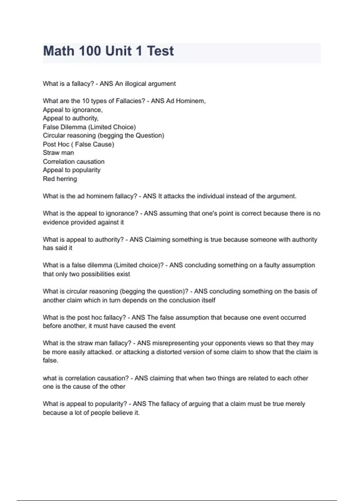 Math 100 Unit 1 Test Questions & Correct Answers Guaranteed Pass.