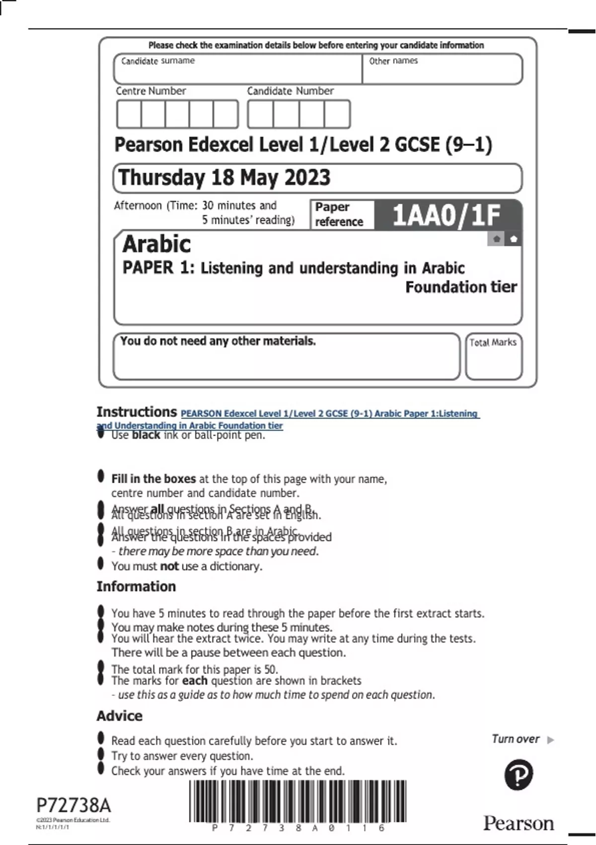 Instructions PEARSON Edexcel Level 1/Level 2 GCSE (9-1) Arabic Paper 1:Listening