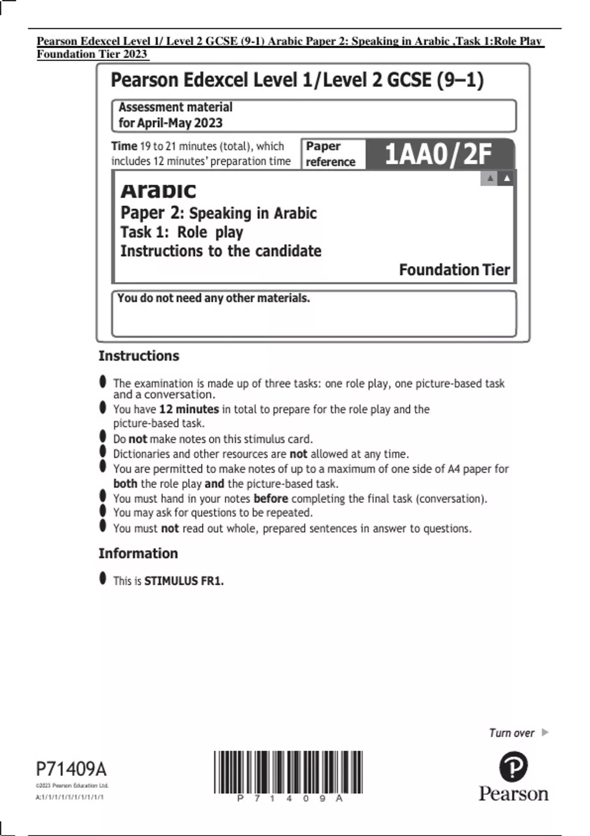 Pearson Edexcel Level 1/ Level 2 GCSE (9-1) Arabic Paper 2: Speaking in Arabic ,Task 1:Role Play Foundation Tier 2023