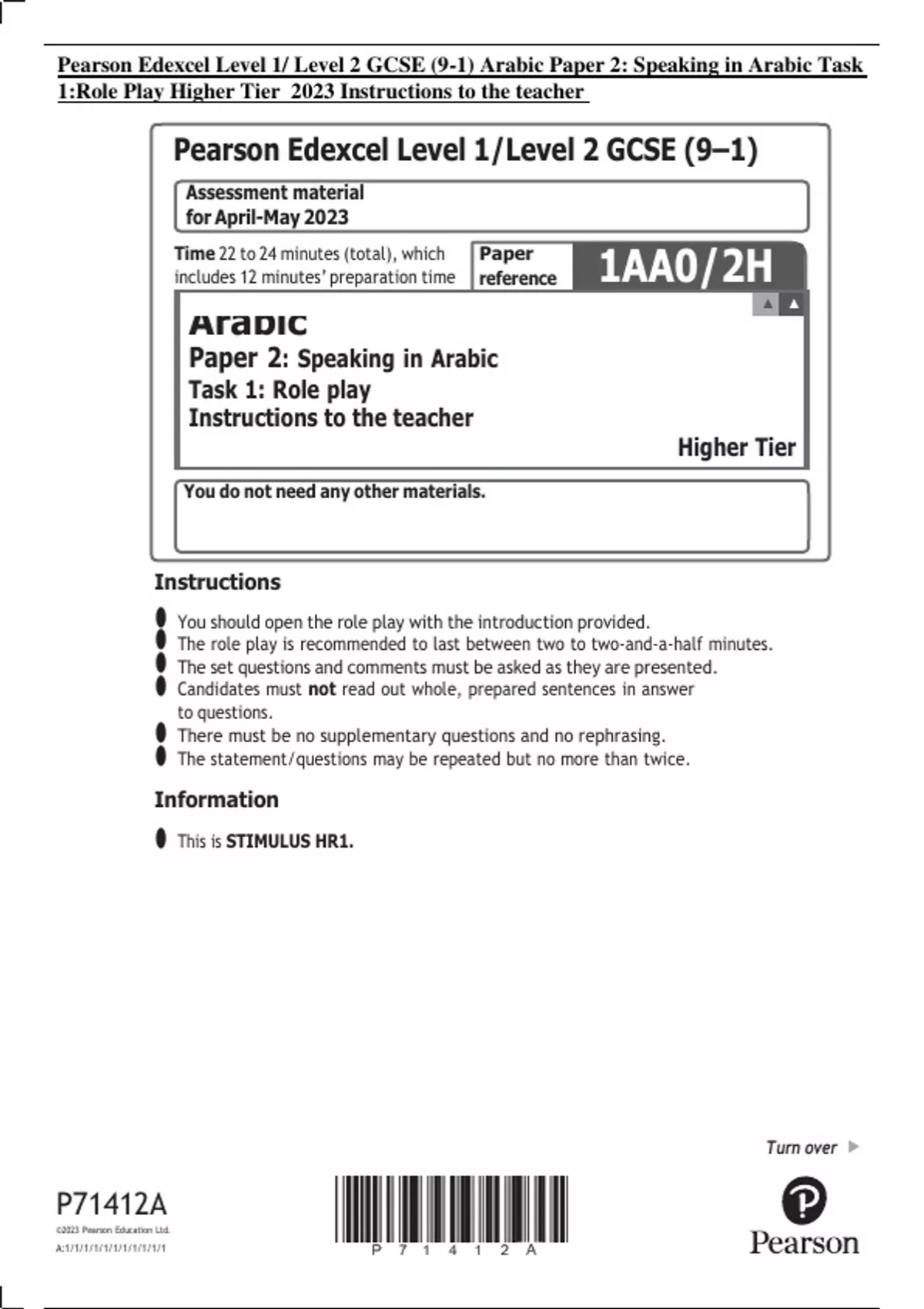 1:Role Play Higher Tier 2023 Instructions to the teacher