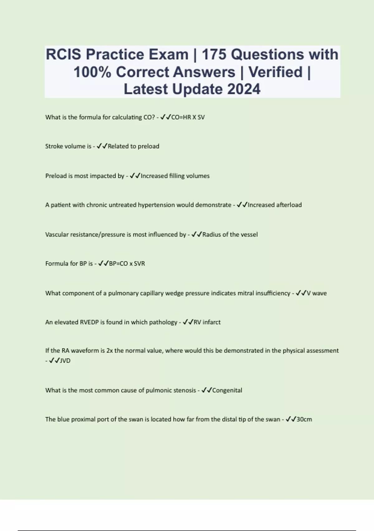 What is the formula for calculating CO? - CO=HR X SV Stroke volume is - Related to preload Preload is most impacted by - Increased filling volumes A patient with chronic untreated hypertension would demonstrate - Increased afterload Vascular resistance/pressure is most influenced by - Radius of the vessel Formula for BP is - BP=CO x SVR What component of a pulmonary capillary wedge pressure indicates mitral insufficiency - V wave An elevated RVEDP is found in which pathology - RV infarct If the RA waveform is 2x the normal value, where would this be demonstrated in the physical assessment - JVD What is the most common cause of pulmonic stenosis - Congenital The blue proximal port of the swan is located how far from the distal tip of the swan - 30cm