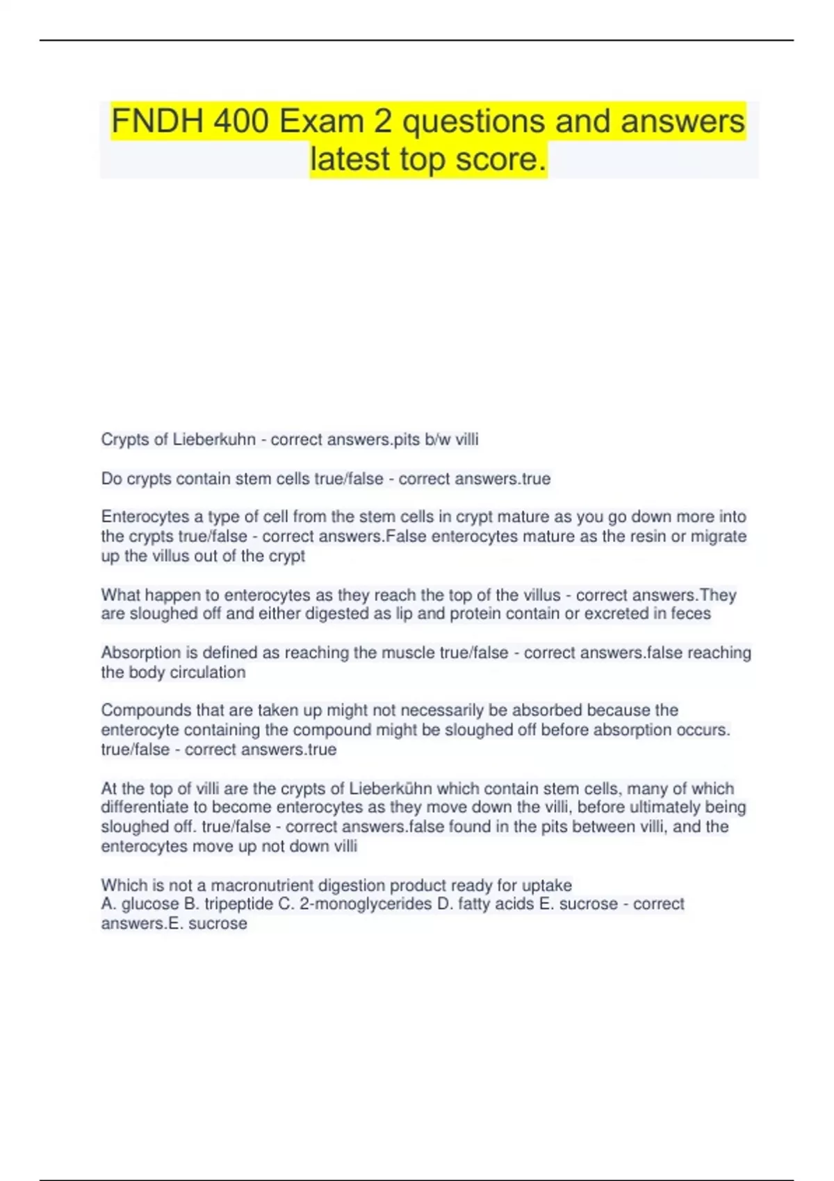 FNDH 400 Exam 2 questions and answers latest top score. Crypts of Lieberkuhn - correct b/w villi Do crypts contain stem cells true/false - correct Enterocytes a type of cell from the stem cells in crypt mature as you go down more into the crypts true/false - correct answers.False enterocytes mature as the resin or migrate up the villus out of the crypt What happen to enterocytes as they reach the top of the villus - correct answers.They are sloughed off and either digested as lip and protein contain or excreted in feces Absorption is defined as reaching the muscle true/false - correct reaching the body circulation Compounds that are taken up might not necessarily be absorbed because the enterocyte containing the compound might be sloughed off before absorption occurs. true/false - correct At the top of villi are the crypts of Lieberkühn which contain stem cells, many of which differentiate to become enterocytes as they move down the villi, before ultimately being sloughed off. true/false - correct found in the pits between villi, and the enterocytes move up not down villi Which is not a macronutrient digestion product ready for uptake A. glucose B. tripeptide C. 2-monoglycerides D. fatty acids E. sucrose - correct answers.E. sucrose Which is not a protein the thelps move compounds through the phospholipid bilayer cell membrane A. pump B. carrier C. channel D. transporter E. tunnel - correct answers.E. tunnel Active transport does not require energy to move with a concentration gradient true/false - correct answers.False passive does active requires energy to move against the concentration gradient Cleaving a phosphate bond (dephosphorylation) generally releases energy. true/false - correct Osmosis moves solvent instead of solute true/false - correct A solute moving from lower concentration to higher concentration across a membrane is moving with its concentration gradient. true/false - correct moving against its concentration gradient What are the three forms of passive uptake/transport - correct e diffusion, osmosis, facilitated diffusion n simple diffusion, a solute moves from a region with higher solute concentration across a membrane to a region with lower solute concentration with the help of a protein true/false - correct everything is true accept it does not need help from a protein n osmosis, water moves from a region with higher solute concentration across a membrane to a region with lower solute concentration. true/false - correct low concentration to high concentration Facilitated diffusion is like simple diffusion except that a carrier or transport protein is needed to facilitate solute movement across the membrane. true/false - correct Active carrier transport and facilitated diffusion both use a carrier or transport protein, but active carrier transport uses energy and moves with the concentration gradient. true/false - correct moves against the concentration gradient A compound that is endocytosed is taken into the cell in vesicles formed from the cell membrane. true/fals - correct Match each term with the correct thing it is taken up by A. Monosachcarides B. Glucose/Galactose C. Fructose 1. SGLT1 2. GLUT5 3. enterocyte - correct answers.A-3 B-1 C-2