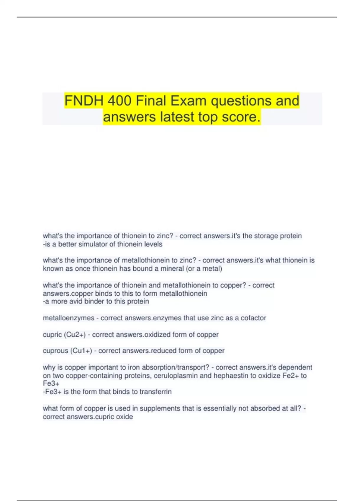 FNDH 400 Final Exam questions and answers latest top score. what's the importance of thionein to zinc? - correct 's the storage protein -is a better simulator of thionein levels what's the importance of metallothionein to zinc? - correct 's what thionein is known as once thionein has bound a mineral (or a metal) what's the importance of thionein and metallothionein to copper? - correct r binds to this to form metallothionein -a more avid binder to this protein metalloenzymes - correct es that use zinc as a cofactor cupric (Cu2+) - correct zed form of copper cuprous (Cu1+) - correct ed form of copper why is copper important to iron absorption/transport? - correct 's dependent on two copper-containing proteins, ceruloplasmin and hephaestin to oxidize Fe2+ to Fe3+ -Fe3+ is the form that binds to transferrin what form of copper is used in supplements that is essentially not absorbed at all? - correct c oxide why can copper deficiency result in hypochromic anemia? - correct can result in a secondary iron deficiency, since Fe2+ cannot be oxidized to Fe3+ to bind to transferrin what are Kayser-Fleischer rings? - correct n to greenish-brown rings around the edges of the cornea -result of copper toxicity what do Kayser-Fleischer rings result from? - correct n's disease -a genetic disorder where a mutation in ATP7B prevents copper excretion, resulting in copper toxicity how can high zinc consumption lead to deficiencies in copper and iron? - correct answers.-no ceruloplasmin is produced and released into circulation -decreasing ceruloplasmin in circulation and hephaestin on the membrane of the enterocyte which normally convert Fe2+ to Fe3+ so that iron can bind to transferrin -without them Fe3+ is not formed from Fe2+ -Fe2+ is "trapped" in the enterocyte because it can't bind to transferrin -enterocytes containing the "trapped" iron move up the crypt and are also sloughed off and excreted in feces -iron consumed essentially is lost from the body through this process what are electrolytes? - correct unds that separate into ions (molecules with a charge) in water what are cations? - correct that have a positive charge -a class of electrolytes what are anions? - correct that have a negative charge -a class of electrolytes how can increased plasma sodium concentrations lead to increased blood pressure in salt-sensitive individuals? - correct answers.-salt-sensitive means blood pressure increases with increased salt intake and decreases with decreased salt intake -increased plasma sodium concentrations increases plasma volume and blood pressure prevalence of salt-sensitivity - correct answers.-25% of normotensive (normal blood pressure) individuals -50% of hypertensive individuals are salt-sensitive salt's relation to hypertension - correct answers.(high blood pressure), which increases their risk of developing cardiovascular disease -salt and/or sodium intake is believed to be a major causative factor