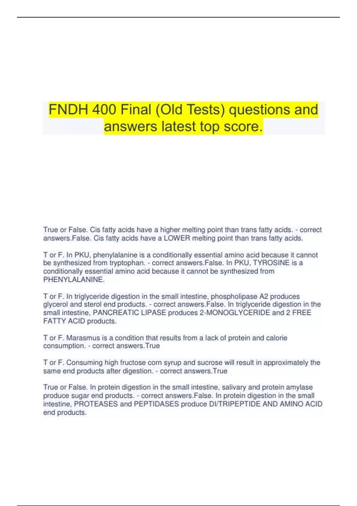 FNDH 400 Final (Old Tests) questions and answers latest top score. True or False. Cis fatty acids have a higher melting point than trans fatty acids. - correct answers.False. Cis fatty acids have a LOWER melting point than trans fatty acids. T or F. In PKU, phenylalanine is a conditionally essential amino acid because it cannot be synthesized from tryptophan. - correct answers.False. In PKU, TYROSINE is a conditionally essential amino acid because it cannot be synthesized from PHENYLALANINE. T or F. In triglyceride digestion in the small intestine, phospholipase A2 produces glycerol and sterol end products. - correct answers.False. In triglyceride digestion in the small intestine, PANCREATIC LIPASE produces 2-MONOGLYCERIDE and 2 FREE FATTY ACID products. T or F. Marasmus is a condition that results from a lack of protein and calorie consumption. - correct answers.True T or F. Consuming high fructose corn syrup and sucrose will result in approximately the same end products after digestion. - correct answers.True True or False. In protein digestion in the small intestine, salivary and protein amylase produce sugar end products. - correct answers.False. In protein digestion in the small intestine, PROTEASES and PEPTIDASES produce DI/TRIPEPTIDE AND AMINO ACID end products. True or False. Omega-3 fatty acids are more inflammatory than omega-6 fatty acids because of the eicosanoids produced by them. - correct answers.False. Omega-6 fatty acids are more inflammatory than omega-3 fatty acids because of the eicosanoids produced by them. True or False. A limiting amino acid is an essential amino acid that is found in inadequate amounts in a lacking protein. - correct answers.False. A limiting amino acid is an essential amino acid that is found in inadequate amounts in a INCOMPLETE protein. True or False. Oligosaccharides contain beta 1-6 bonds which allows them to survive digestion and then be excreted in feces. - correct answers.False. Oligosaccharides contain ALPHA 1-6 bonds which allows them to survive digestion and then be FERMENTED IN THE COLON. True or False. In carbohydrate digestion in the small intestine, salivary amylase and gastric amylase produce amino acid end products. - correct answers.False. In carbohydrate digestion in the small intestine, PANCREATIC amylase and DISACCHARIDASES produce MONOSACCHARIDE end products. True or False. Bile is produced by the pancreas, and stored in the liver, acts as an emulsifier during digestion. - correct answers.False. Bile is produced by the LIVER, and stored in the GALLBLADDER, acts as an emulsifier during digestion. True or False. Saccharine's structure is similar to sucrose, but it has chlorine replacing hydroxyl molecules. - correct answers.False. SUCRALOSE structure is similar to sucrose, but it has chlorine replacing hydroxyl molecules. True or False. Eating more "good cholesterol" and less "bad cholesterol" will reduce CVD risk. - correct answers.False. Eating more "good cholesterol" and less "bad cholesterol" will NOT reduce CVD risk. True or False. The brain uses ketone bodies instead of fatty acids, because it cannot efficiently perform de novo lipogenesis. - correct answers.False. The brain uses ketone bodies instead of fatty acids, because it cannot efficiently perform BETA-OXIDATION. True or False. Lack of fiber in your diet can lead to two different common digestive problems; gall stones and peptic ulcers. - correct answers.False. Lack of fiber in your diet can lead to two different common digestive problems; DIVERTICULOSIS and HEMORRHOIDS. True or False. Lipogenesis is a catabolic pathway, while lipolysis is an anabolic pathway. - correct answers.False. Lipogenesis is a ANABOLIC pathway, while lipolysis is an CATABOLIC pathway.
