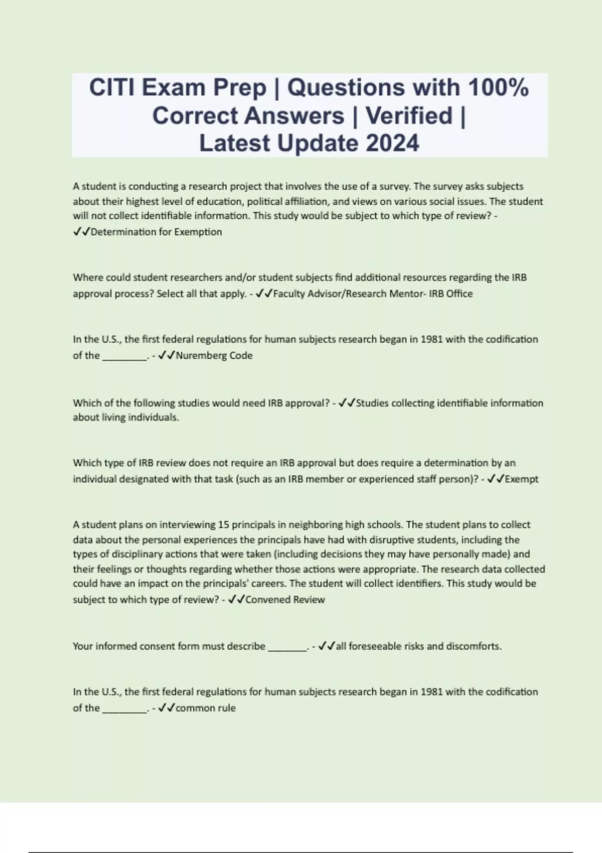 CITI Exam Prep | Questions with 100% Correct Answers | Verified | Latest Update 2024