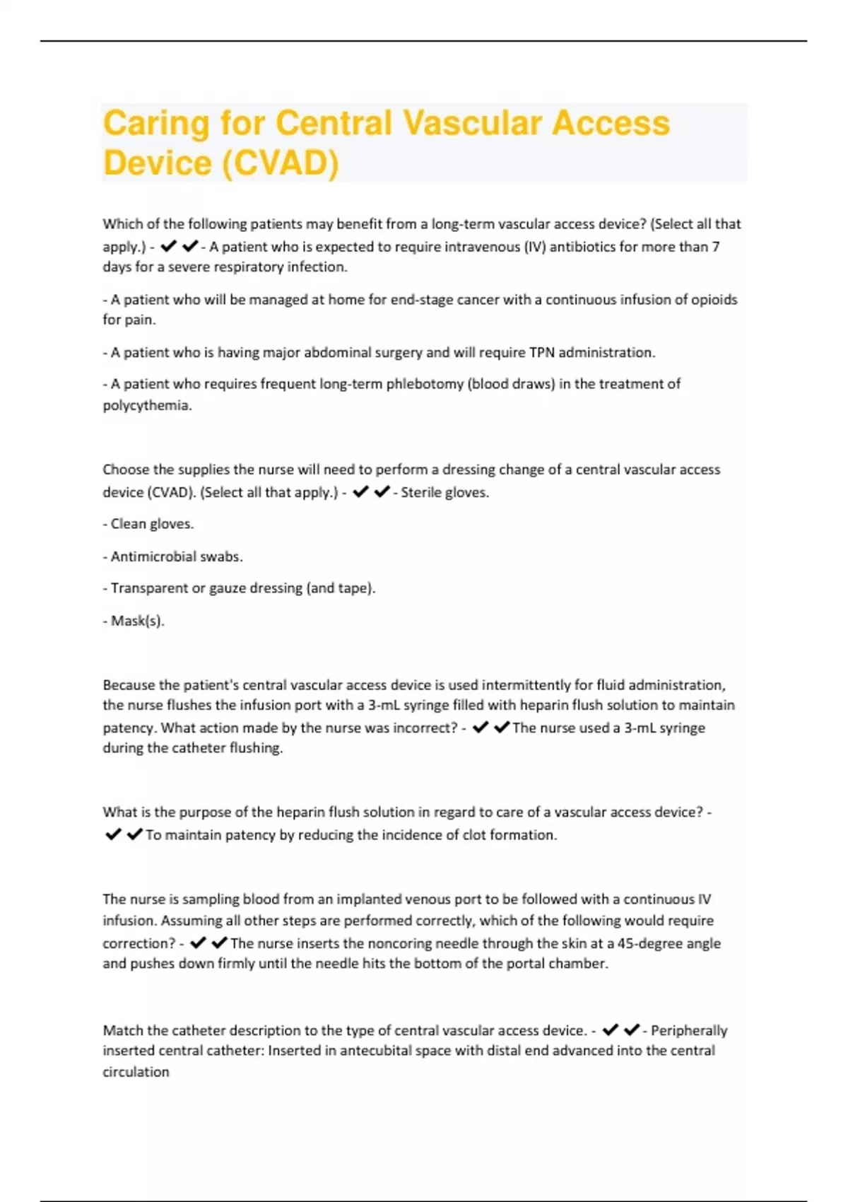 Which of the following patients may benefit from a long-term vascular access device? (Select all that apply.) - - A patient who is expected to require intravenous (IV) antibiotics for more than 7 days for a severe respiratory infection. - A patient who will be managed at home for end-stage cancer with a continuous infusion of opioids for pain. - A patient who is having major abdominal surgery and will require TPN administration. - A patient who requires frequent long-term phlebotomy (blood draws) in the treatment of polycythemia. Choose the supplies the nurse will need to perform a dressing change of a central vascular access device (CVAD). (Select all that apply.) - - Sterile gloves. - Clean gloves. - Antimicrobial swabs. - Transparent or gauze dressing (and tape). - Mask(s). Because the patient's central vascular access device is used intermittently for fluid administration, the nurse flushes the infusion port with a 3-mL syringe filled with heparin flush solution to maintain patency. What action made by the nurse was incorrect? - The nurse used a 3-mL syringe during the catheter flushing. What is the purpose of the heparin flush solution in regard to care of a vascular access device? - To maintain patency by reducing the incidence of clot formation. The nurse is sampling blood from an implanted venous port to be followed with a continuous IV infusion. Assuming all other steps are performed correctly, which of the following would require correction? - The nurse inserts the noncoring needle through the skin at a 45-degree angle and pushes down firmly until the needle hits the bottom of the portal chamber. Match the catheter description to the type of central vascular access device. - - Peripherally inserted central catheter: Inserted in antecubital space with distal end advanced into the central circulation- Tunneled central vascular access device: Inserted first through subcutaneous tissue, then into a large vein and threaded into the distal end of the superior vena cava - Percutaneous central vascular access device: Inserted directly through the skin into a large vein - Implanted venous port: Requires a noncoring needle to access device Match the correct preventive measure to the potential complication of a vascular access device. - - Avoid trauma; avoid placement near site of local disease: Catheter migration - Do not leave catheter hub open to air; engage clamps if appropriate for device: Air embolism - Follow routine flushing with positive pressure; flush between medications: Occlusion - Use strict hand hygiene and aseptic technique: Infection - Use needleless system to access port: Catheter damage, breakage A patient with a CVAD suddenly develops dyspnea, tachycardia, and hypotension. Into which position should the nurse place the patient? - On left side with head down
