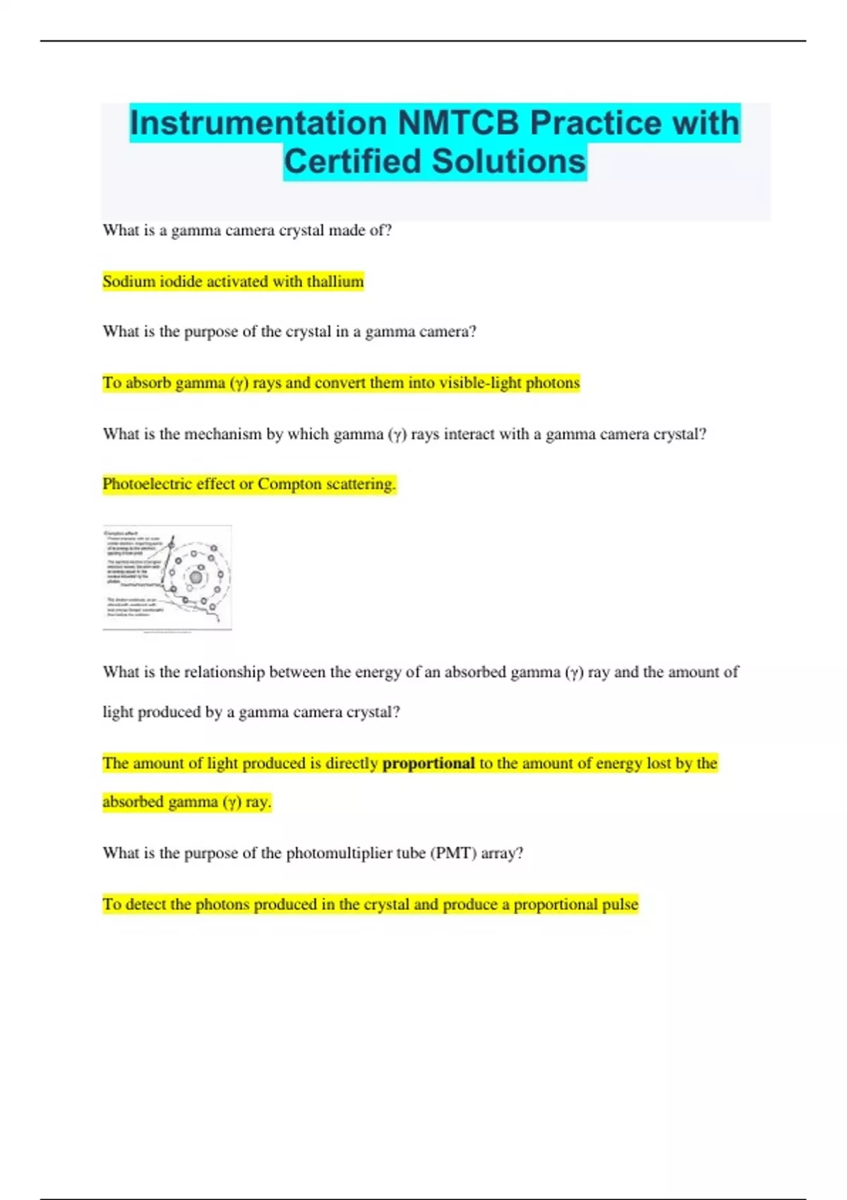 Instrumentation NMTCB Practice with Certified Solutions What is a gamma camera crystal made of? Sodium iodide activated with thallium What is the purpose of the crystal in a gamma camera? To absorb gamma (γ) rays and convert them into visible-light photons What is the mechanism by which gamma (γ) rays interact with a gamma camera crystal? Photoelectric effect or Compton scattering. What is the relationship between the energy of an absorbed gamma (γ) ray and the amount of light produced by a gamma camera crystal? The amount of light produced is directly proportional to the amount of energy lost by the absorbed gamma (γ) ray. What is the purpose of the photomultiplier tube (PMT) array? To detect the photons produced in the crystal and produce a proportional pulse How does increasing crystal thickness influence camera sensitivity and resolution? Thick crystals have higher sensitivity but lower resolution (i.e., thicker than 0.5 inch or 1 cm) What is the output of a single PMT? A pulse (very small signal) that represents amplification of the light detected. The PMTs are __________ to the crystal by optical grease or a light pipe. optically coupled What is the output of the PMT array decoder circuit? Spatial coordinates (x+ , x- , y+ , y- ) of the scintillation event. How does increasing the number of PMTs affect the resolution? It improves the resolution. How many PMTs are in a modern gamma camera? 75 or 91 per head The electronic component in a gamma camera that is used to disregard unwanted photons is called __________. a pulse height analyzer Why do scattered photons from within the patient cause major imaging difficulties? The scattered photons lead to incorrectly positioned radioactive events. What is the "window" in a pulse height analyzer (PHA)? The range of acceptable energies around a photopeak. What are the energy limits of a 20% window centered at 140 keV? 126 to 154 keV ******** 140kev(0.20) = 28 28/2 = 14 140 +14 = 154 kev 140 -14 = 126kev Why do some gamma cameras have multiple PHAs? To acquire several peaks simultaneously (e.g., 67Ga). What is a gamma camera collimator made of? lead or tungsten What is the purpose of a gamma camera collimator? Project an image of the source distribution directly onto the crystal What does the term "collimator sensitivity" mean? The ratio of gamma (γ) rays that pass through the collimator to those incident upon it. When is it appropriate to use a pinhole collimator? When imaging small organs that lie close to the skin (e.g., thyroid gland) . What are the principal disadvantages of a pinhole collimator? Image distortion and poor sensitivity Walls within the collimator that separate adjacent holes are called _________ collimator septa What is the purpose of collimator septa? To block gamma (γ) rays traveling obliquely toward the crystal. The presence of a starburst-type appearance when imaging a hot object with a parallel-hole collimator is due to __________. septal penetration What defines the energy range of a collimato