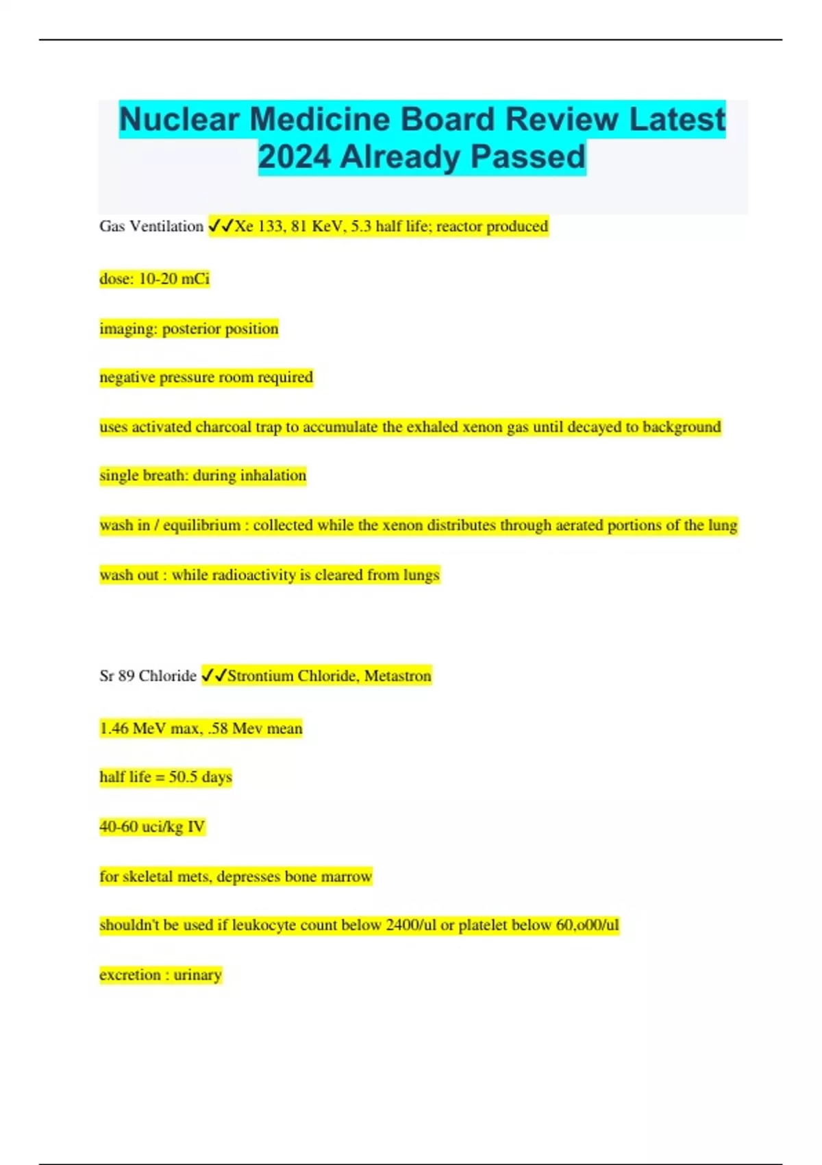 Nuclear Medicine Board Review Latest 2024 Already Passed Gas Ventilation Xe 133, 81 KeV, 5.3 half life; reactor produced dose: 10-20 mCi imaging: posterior position negative pressure room required uses activated charcoal trap to accumulate the exhaled xenon gas until decayed to background single breath: during inhalation wash in / equilibrium : collected while the xenon distributes through aerated portions of the lung wash out : while radioactivity is cleared from lungs Sr 89 Chloride Strontium Chloride, Metastron 1.46 MeV max, .58 Mev mean half life = 50.5 days 40-60 uci/kg IV for skeletal mets, depresses bone marrow shouldn't be used if leukocyte count below 2400/ul or platelet below 60,o00/ul excretion : urinary I 131 Tositumomab Bexxar half life = 8.04 days 606.3 KeV max energy treatment of patients with NHL before treatment, patient must receive 650 mg acetaminophen and 50mg diphydramine orally thyroid uptake should be minimized with SSKI activity initially seen in blood pool, liver and spleen later times, activity in liver, spleen, thyroid, bladder, and tumor sites Y 90 ibritumomab tiuxtetan Zevalin half life = 2.67 days 2.281 MeV treatment of patients with NHL (disseminated follicular B-Cell) monoclonal antibody against lymphoma antigens before treatment, patient must receive 650 mg (imaging) acetaminophen and 50mg diphydramine orally max dose = 32 mci platelets must be at least 100,000/mm3 Sm 153 EDTMP ethylenediaminetetra methylene phosphonic Quadramet half life = 46.7 hours 0.81 MeV maximum concentrates in bone marrow for patients with more metabolically activate metastases from prostate or breast cancer, as well as those from osteogenic sarcoma 1.0mci/kg urinary excretion Bone therapy blood requirements 60,000-100,000/ul platelet /ul leukocyte 2000/ul granuolyte I 131 MIBG metaiodobenzylguanidine half life = 8.06 days localization/treatment of primary or metastatic pheochromocytomas/ neuroblastoma 8.04 days kidney/ urinary excretion I 131 Sodium Iodide half life = 8.06 days used to treat hyperthyroidism, thyroid carcinoma 10-15 mCi for graves 20-30 mCi for nodular goiters *special release precautions Blood Brain Barrier Imaging Tc99m Pertechnetate -least desirable (accumulated in choroid plexus) -15-30mCi -premed with KCLO4- preferred Tc99m Pentetate (DTPA) -planar -cleared by kidneys Dynamic imaging: