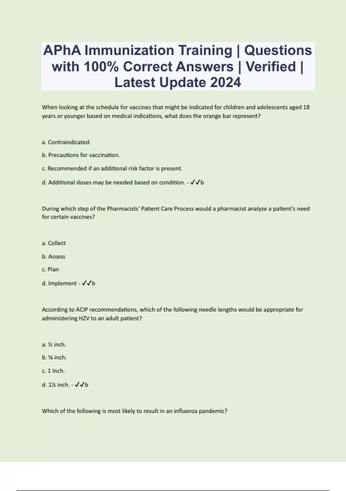 APhA Immunization Training | Questions with 100% Correct Answers | Verified | Latest Update 2024