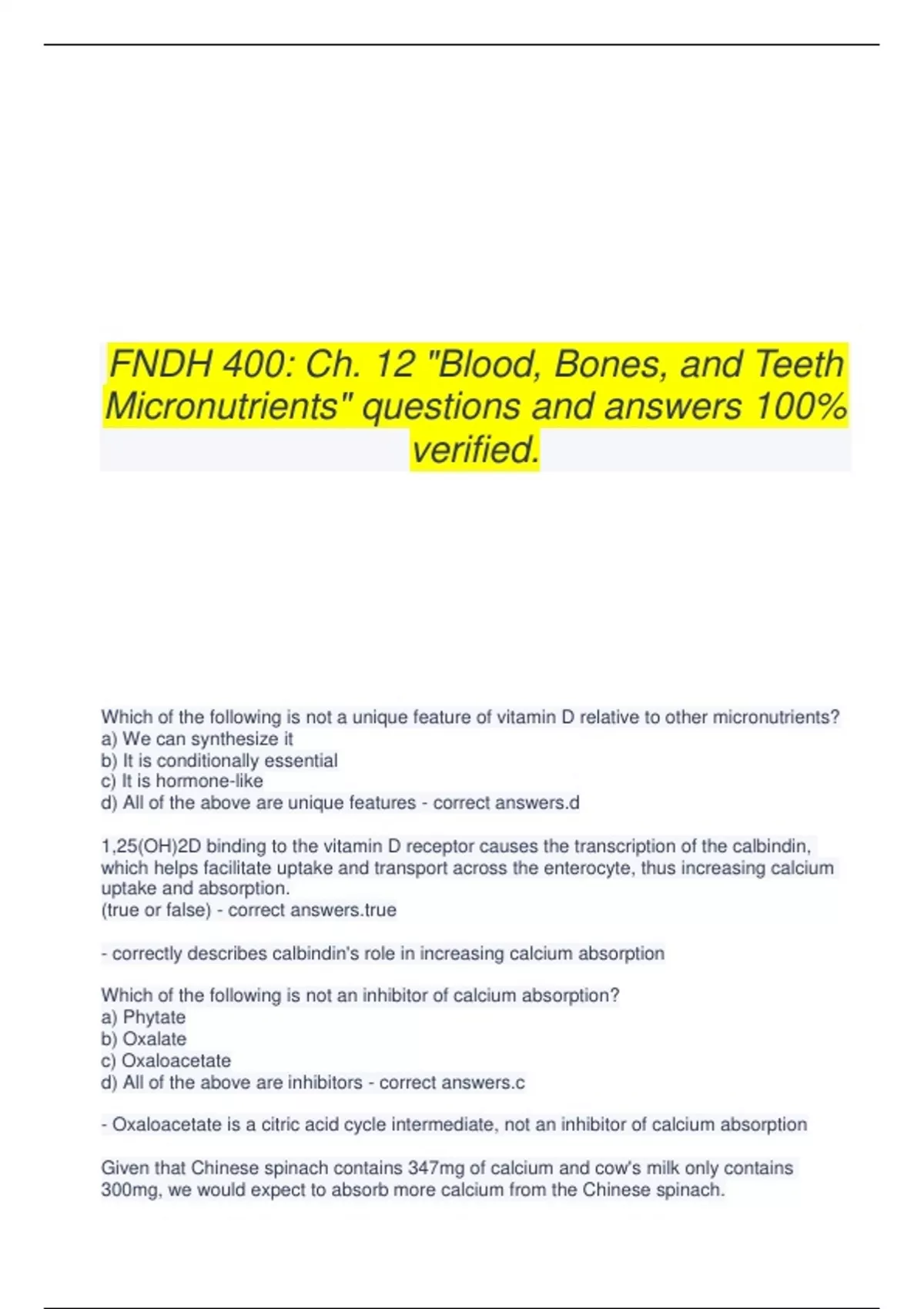 FNDH 400: Ch. 12 "Blood, Bones, and Teeth Micronutrients" questions and answers 100% verified. Which of the following is not a unique feature of vitamin D relative to other micronutrients? a) We can synthesize it b) It is conditionally essential c) It is hormone-like d) All of the above are unique features - correct answers.d 1,25(OH)2D binding to the vitamin D receptor causes the transcription of the calbindin, which helps facilitate uptake and transport across the enterocyte, thus increasing calcium uptake and absorption. (true or false) - correct - correctly describes calbindin's role in increasing calcium absorption Which of the following is not an inhibitor of calcium absorption? a) Phytate b) Oxalate c) Oxaloacetate d) All of the above are inhibitors - correct answers.c - Oxaloacetate is a citric acid cycle intermediate, not an inhibitor of calcium absorption Given that Chinese spinach contains 347mg of calcium and cow's milk only contains 300mg, we would expect to absorb more calcium from the Chinese spinach. (true or false) - correct - It takes 3.3 servings of Chinese spinach to equal 1 serving of cow's milk even though it contains more calcium. - Chinese spinach, like many natural plant sources, contains more inhibitors which lowers the bioavailability of its calcium Which following source will result in the highest calcium bioavailability? a) Calcium citrate b) Calcium citrate malate c) Skim milk d) There is not significant difference between these sources - correct answers.c - Research has found no significant differences between these sources Which of the following is not a function of calcium? a) Binds to troponin in muscle contraction b) Cofactor for a heme synthesis enzyme c) Calcium channels control neurotransmitter release d) Binds to Gla proteins in the blood clotting cascade e) Calcium channels stimulate hormone release - correct answers.b - It is not a cofactor for heme synthesis (unlike vitamin B6) When considering the osteopenia, osteomalacia and osteoporosis, which is not correct? a) Osteopenia: decreased bone mass, matrix:mineral ratio normal b) Osteoporosis: same as osteopenia, greater decrease in bone mass c) Osteomalacia: increased matrix:mineral ratio, bone mass is normal d) Osteomalacia: decreased matrix:mineral ratio, bone mass is normal d) All of the above are correct - correct answers.d - Because there is greater protein matrix and less mineral, in osteomalacia bone mass is normal, but the matrix:mineral ratio is increased Nearly all peak bone mass is built before a person can legally purchase alcoholic beverages in the US (21 years of age). (true or false) - correct - 90% of peak bone mass is built by 18 in females and 20 in males Females have higher levels of osteoporosis because even though they have higher peak bone mass than males, they have a much steeper decline during menopause. (true or false) - correct - females have lower peak bone mass than males Dual energy X-ray absorptiometry measures bone mineral density and provides a t-score that can be used to understand a person's bone health/status. (true or false) - correct