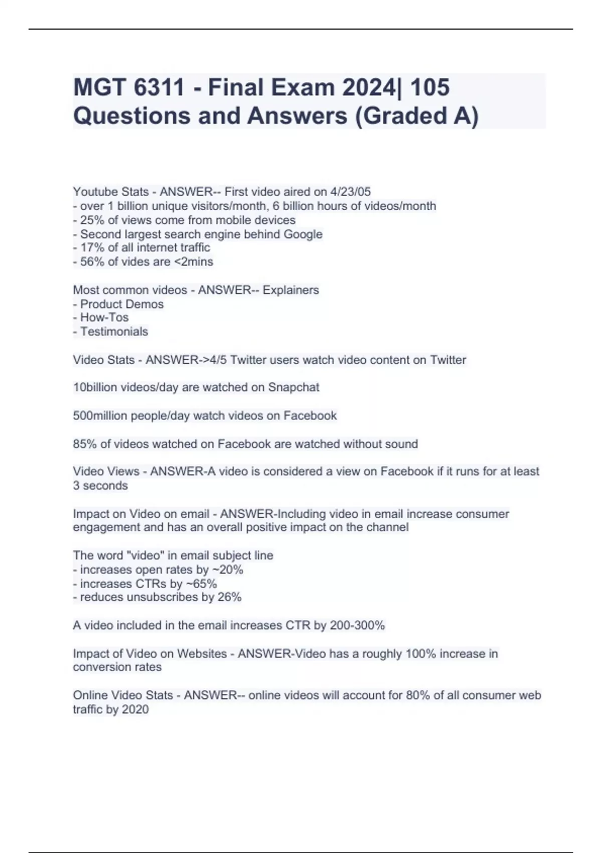MGT 6311 - Final Exam 2024| 105 QuMGT 6311 - Final Exam 2024| 105 Questions and Answers (Graded A) MGT 6311 - Final Exam 2024| 105 Questions and Answers (Graded A) estions and Answers (Graded A) Youtube Stats - ANSWER-- First video aired on 4/23/05 - over 1 billion unique visitors/month, 6 billion hours of videos/month - 25% of views come from mobile devices - Second largest search engine behind Google - 17% of all internet traffic - 56% of vides are <2mins Most common videos - ANSWER-- Explainers - Product Demos - How-Tos - Testimonials Video Stats - ANSWER->4/5 Twitter users watch video content on Twitter 10billion videos/day are watched on Snapchat