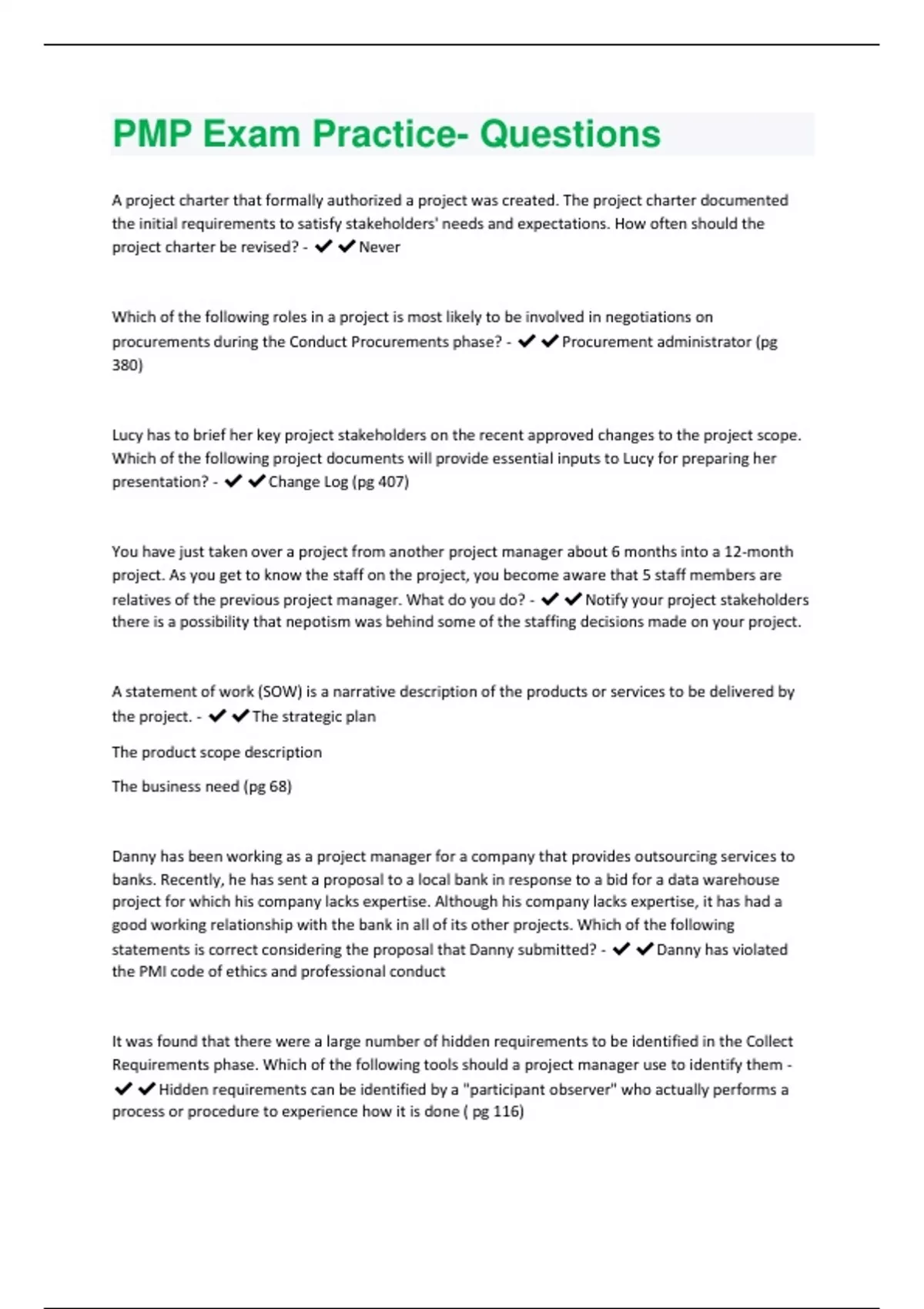 A project charter that formally authorized a project was created. The project charter documented the initial requirements to satisfy stakeholders' needs and expectations. How often should the project charter be revised? - Never Which of the following roles in a project is most likely to be involved in negotiations on procurements during the Conduct Procurements phase? - Procurement administrator (pg 380) Lucy has to brief her key project stakeholders on the recent approved changes to the project scope. Which of the following project documents will provide essential inputs to Lucy for preparing her presentation? - Change Log (pg 407) You have just taken over a project from another project manager about 6 months into a 12-month project. As you get to know the staff on the project, you become aware that 5 staff members are relatives of the previous project manager. What do you do? - Notify your project stakeholders there is a possibility that nepotism was behind some of the staffing decisions made on your project. A statement of work (SOW) is a narrative description of the products or services to be delivered by the project. - The strategic plan The product scope description The business need (pg 68) Danny has been working as a project manager for a company that provides outsourcing services to banks. Recently, he has sent a proposal to a local bank in response to a bid for a data warehouse project for which his company lacks expertise. Although his company lacks expertise, it has had a good working relationship with the bank in all of its other projects. Which of the following statements is correct considering the proposal that Danny submitted? - Danny has violated the PMI code of ethics and professional conduct It was found that there were a large number of hidden requirements to be identified in the Collect Requirements phase. Which of the following tools should a project manager use to identify them - Hidden requirements can be identified by a "participant observer" who actually performs a process or procedure to experience how it is done ( pg 116)Lynn is the project manager of a project. She creates a structure similar to the Work Breakdown Structure (WBS). However, instead of being arranged according to the project deliverables, it is arranged according to the team's existing departments and units. The project activities and work packages are listed against each existing department. This would be called: - An Organizational Breakdown Structure (OBS) pg 261 Which of the following structures helps track project costs and can be aligned with the organization's accounting system? - The Work Breakdown Structure (WBS) provides the framework for the cost management plan. pg 199 The Project Scope Management Knowledge Area is primarily concerned with: - Defining and controlling what is and what is not included in the project. pg 105