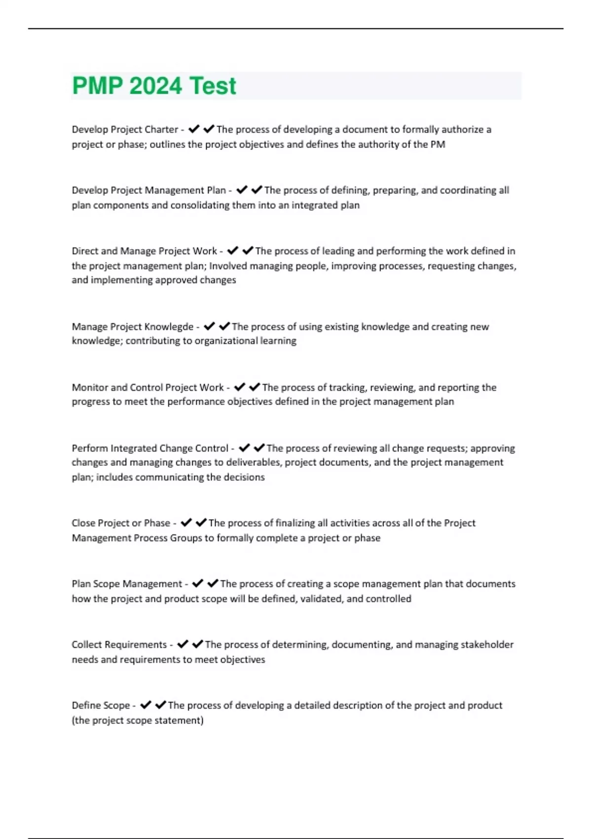 Develop Project Charter - The process of developing a document to formally authorize a project or phase; outlines the project objectives and defines the authority of the PM Develop Project Management Plan - The process of defining, preparing, and coordinating all plan components and consolidating them into an integrated plan Direct and Manage Project Work - The process of leading and performing the work defined in the project management plan; Involved managing people, improving processes, requesting changes, and implementing approved changes Manage Project Knowlegde - The process of using existing knowledge and creating new knowledge; contributing to organizational learning Monitor and Control Project Work - The process of tracking, reviewing, and reporting the progress to meet the performance objectives defined in the project management plan Perform Integrated Change Control - The process of reviewing all change requests; approving changes and managing changes to deliverables, project documents, and the project management plan; includes communicating the decisions Close Project or Phase - The process of finalizing all activities across all of the Project Management Process Groups to formally complete a project or phase Plan Scope Management -The process of creating a scope management plan that documents how the project and product scope will be defined, validated, and controlled Collect Requirements - The process of determining, documenting, and managing stakeholder needs and requirements to meet objectives Define Scope - The process of developing a detailed description of the project and product (the project scope statement)Create WBS - The process of subdividing project deliverables and project work into smaller, more manageable components