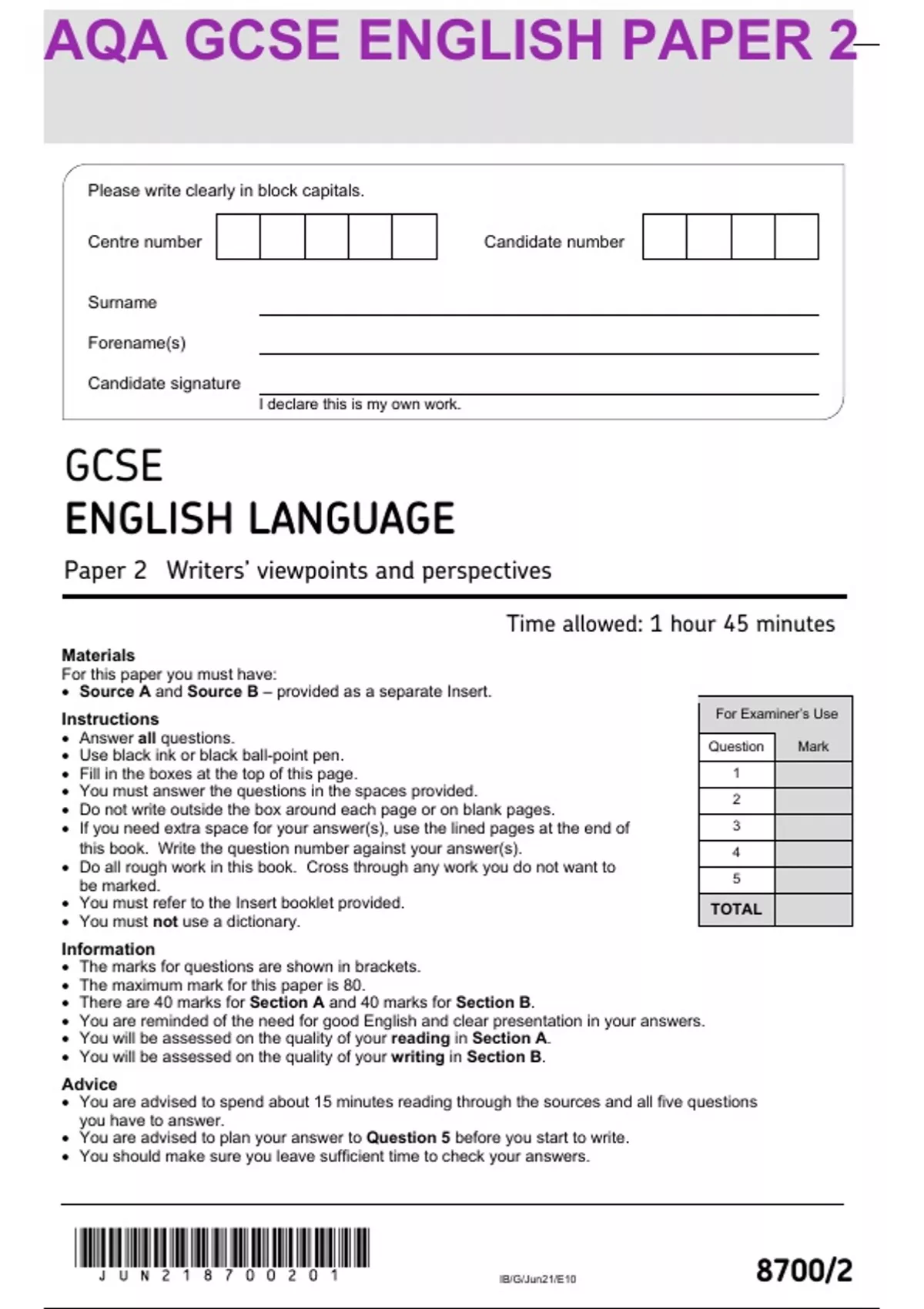 gcse english language paper 2 2023 question only aqa