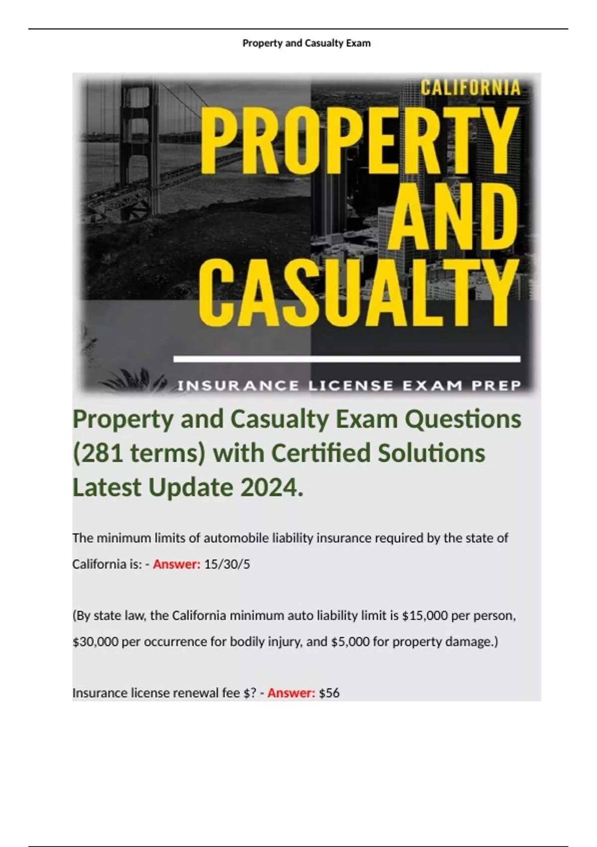 Property and Casualty Exam Questions (281 terms) with Certified Solutions Latest Update 2024. Terms like: The minimum limits of automobile liability insurance required by the state of California is: - Answer: 15/30/5.