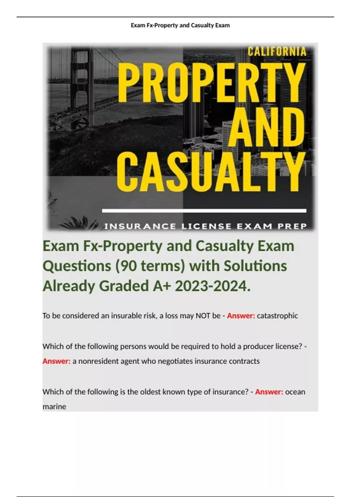 Exam Fx-Property and Casualty Exam Questions (90 terms) with Solutions Already Graded A+ . Terms like; To be considered an insurable risk, a loss may NOT be - Answer: catastrophic