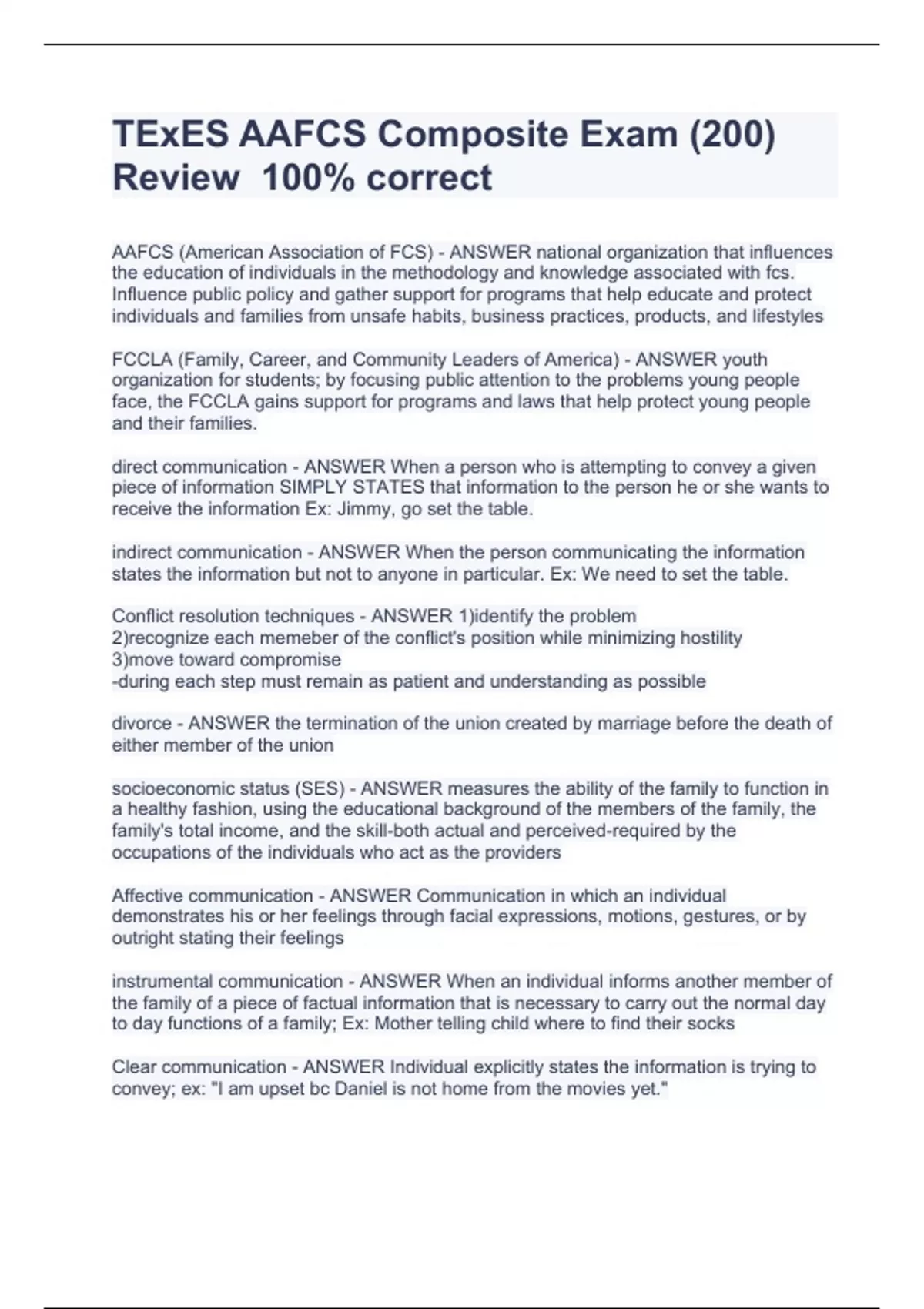 TExES AAFCS Composit AAFCS (American Association of FCS) - ANSWER national organization that influences the education of individuals in the methodology and knowledge associated with fcs. Influence public policy and gather support for programs that help educate and protect individuals and families from unsafe habits, business practices, products, and lifestyles FCCLA (Family, Career, and Community Leaders of America) - ANSWER youth organization for students; by focusing public attention to the problems young people face, the FCCLA gains support for programs and laws that help protect young people and their families. direct communication - ANSWER When a person who is attempting to convey a given piece of information SIMPLY STATES that information to the person he or she wants to receive the information Ex: Jimmy, go set the table. indirect communication - ANSWER When the person communicating the information states the information but not to anyone in particular. Ex: We need to set the table. Conflict resolution techniques - ANSWER 1)identify the problem 2)recognize each memeber of the conflict's position while minimizing hostility 3)move toward compromise -during each step must remain as patient and understanding as possible divorce - ANSWER the termination of the union created by marriage before the death of either member of the union socioeconomic status (SES) - ANSWER measures the ability of the family to function in a healthy fashion, using the educational background of the members of the family, the family's total income, and the skill-both actual and perceived-required by the occupations of the individuals who act as the providers Affective communication - ANSWER Communication in which an individual demonstrates his or her feelings through facial expressions, motions, gestures, or by outright stating their feelings instrumental communication - ANSWER When an individual informs another member of the family of a piece of factual information that is necessary to carry out the normal day to day functions of a family; Ex: Mother telling child where to find their socks Clear communication - ANSWER Individual explicitly states the information is trying to convey; ex: "I am upset bc Daniel is not home from the movies yet." e Exam (200) Review 100% correct