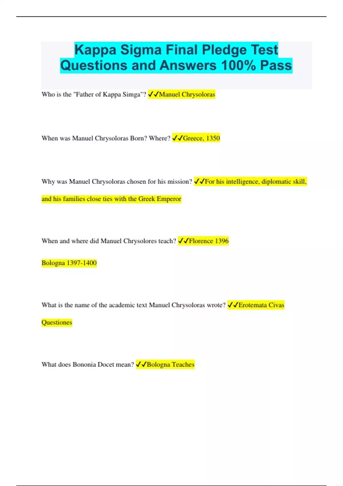 Kappa Sigma Final Pledge Test Questions and Answers 100% Pass Who is the "Father of Kappa Simga"? Manuel Chrysoloras When was Manuel Chrysoloras Born? Where? Greece, 1350 Why was Manuel Chrysoloras chosen for his mission? For his intelligence, diplomatic skill, and his families close ties with the Greek Emperor When and where did Manuel Chrysolores teach? Florence 1396 Bologna What is the name of the academic text Manuel Chrysoloras wrote? Erotemata Civas Questiones What does Bononia Docet mean? Bologna Teaches What museum was the "My Brother's Keeper" pottery found? By who? "My Brother's Keeper" was found in the Benaki Museum of Art by brother Mark Donnell Say my Brothers Keeper Drink in moderation, my dear brother Do not get drunk. Let us spend our time as friends, Never as enemies" Who was the governor of Bologna at the time? Baldassare Cosca When was the University of Bologna Founded? 1088 What year was Kappa Sigma founded internationally? 1400 Who lived in the "City of Letters"? Gratian, Dante, Petrarch, Galileo, Copernicus, Pope Gregory XIII, Galvani, Marconi Who are the Five Brothers? William Grigsby McCormick, George Miles Arnold, John Covert Boyd, Edmund Law Rogers Jr., Frank Courtney Nicodemus What are the four pillars? Fellowship, Leadership, Scholarship, and Service What are the three streets? Strada San Donato, Strada Stefano, Strada Sargozza What are the two towers? Torre Degli Asinelli, Torre Garisendi What is the one Church? Basilica Di San Petronio What was the address of where Kappa Sigma was founded in America? What date did it happen? 46 East Lawn December 10, 1869 When