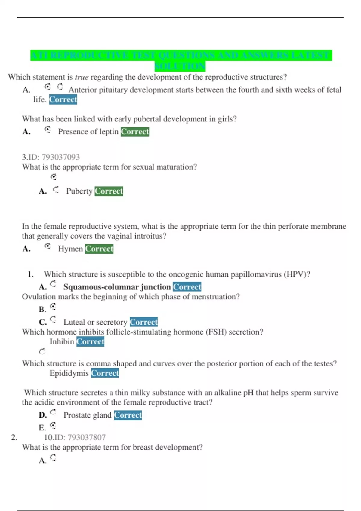 Which statement is true regarding the development of the reproductive structures? A. Anterior pituitary development starts between the fourth and sixth weeks of fetal life. Correct What has been linked with early pubertal development in girls? A. Presence of leptin Correct 3.ID: What is the appropriate term for sexual maturation? A. Puberty Correct In the female reproductive system, what is the appropriate term for the thin perforate membrane that generally covers the vaginal introitus? A. Hymen Correct 1. Which structure is susceptible to the oncogenic human papillomavirus (HPV)? A. Squamous-columnar junction Correct Ovulation marks the beginning of which phase of menstruation? B. C. Luteal or secretory Correct Which hormone inhibits follicle-stimulating hormone (FSH) secretion? Inhibin Correct Which structure is comma shaped and curves over the posterior portion of each of the testes? Epididymis Correct Which structure secretes a thin milky substance with an alkaline pH that helps sperm survive the acidic environment of the female reproductive tract? D. Prostate gland Correct E. 2. 10.ID: What is the appropriate term for breast development? A.B. Thelarche Correct C. D. Which factors help maintain the self-cleansing action of the vagina? (Select all that apply.) E. Acid-base balance that discourages the proliferation of most pathogenic bacteria Correct