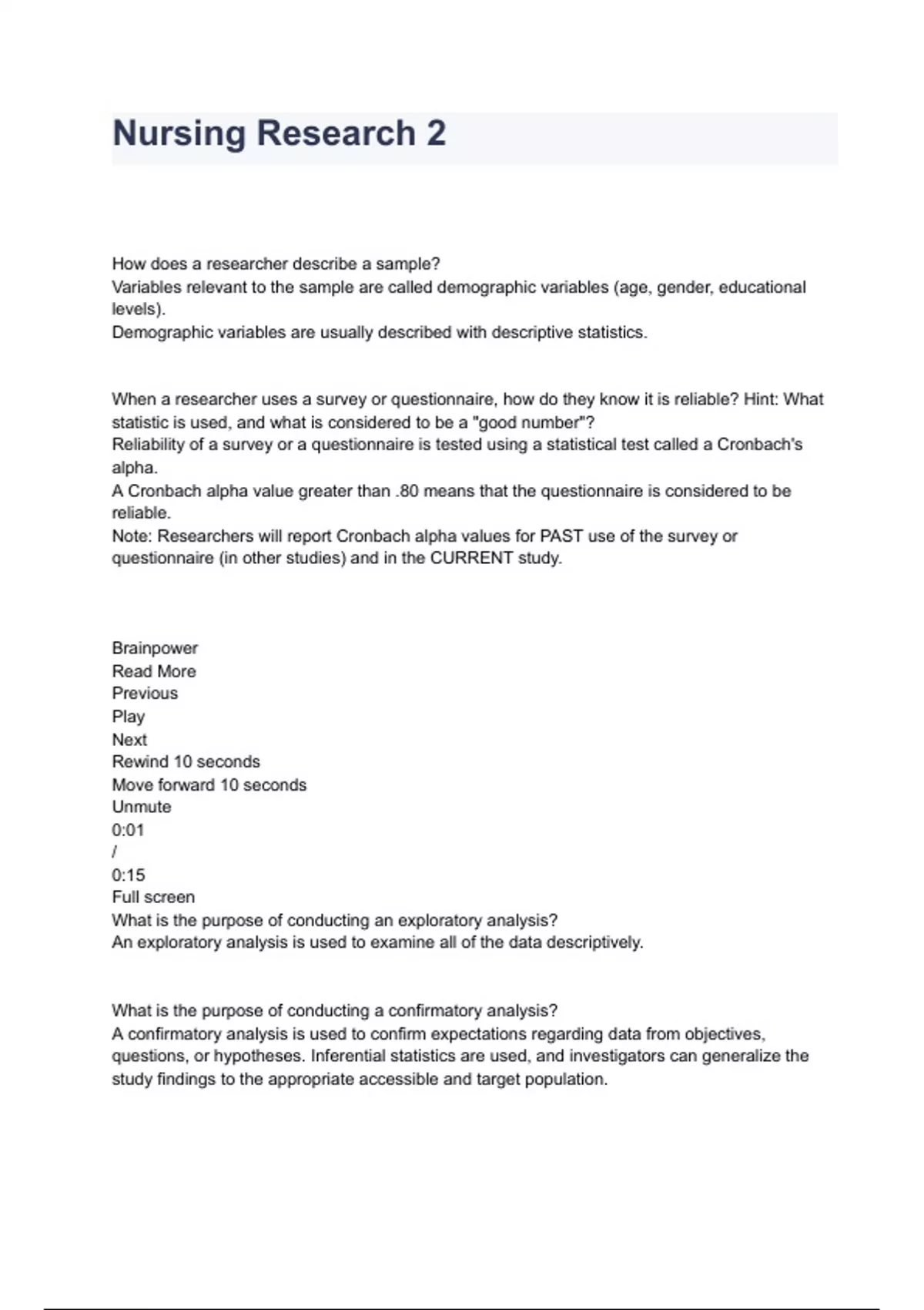 Nursing Research 2 Exam Questions And Answers How does a researcher describe a sample? Variables relevant to the sample are called demographic variables (age, gender, educational levels). Demographic variables are usually described with descriptive statistics. When a researcher uses a survey or questionnaire, how do they know it is reliable? Hint: What statistic is used, and what is considered to be a "good number"? Reliability of a survey or a questionnaire is tested using a statistical test called a Cronbach's alpha. A Cronbach alpha value greater than .80 means that the questionnaire is considered to be reliable. Note: Researchers will report Cronbach alpha values for PAST use of the survey or questionnaire (in other studies) and in the CURRENT study. Brainpower Read More Previous Play Next Rewind 10 seconds Move forward 10 seconds Unmute 0:01 / 0:15 Full screen What is the purpose of conducting an exploratory analysis? An exploratory analysis is used to examine all of the data descriptively. What is the purpose of conducting a confirmatory analysis? A confirmatory analysis is used to confirm expectations regarding data from objectives, questions, or hypotheses. Inferential statistics are used, and investigators can generalize the study findings to the appropriate accessible and target population. What are chi square and analysis of variance (ANOVA) tests used for? To identify differences among groups in a research study. What does "the level of statistical significance" mean, and what is it typically set at for nursing studies? The level of statistical significance is the probability level at which the results of a statistical analysis are judged to indicate a statistically significant difference between the groups. The level of significance for most nursing studies is 0.05. This means that is the level of significance found in the statistical analysis is 0.05 or less, the finding is considered to be statistically significant. What is generalization? the application of information that has been acquired from a specific instance to a general situation. Generalization extends the implications of the findings from the sample studied to a larger population. What is a power analysis? Power is the probability that a statistical test will detect a significant difference that exists. A power analysis can assist you to identify the sample size you will need to avoid a Type II error (or to ensure that a significant difference exists). The minimum acceptable power level is .80 What is effect size? The degree to which the phenomenon is present in the population, or the degree to which the null hypothesis is false.