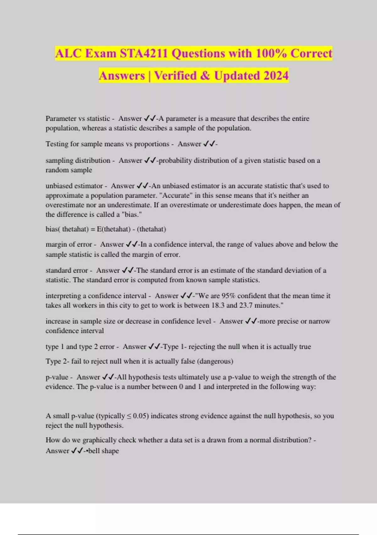 ALC Exam STA4211 Questions with 100% Correct Answers | Verified & Updated 2024 Parameter vs statistic - Answer ️️ -A parameter is a measure that describes the entire population, whereas a statistic describes a sample of the population. Testing for sample means vs proportions - Answer ️️ - sampling distribution - Answer ️️ -probability distribution of a given statistic based on a random sample unbiased estimator - Answer ️️ -An unbiased estimator is an accurate statistic that's used to approximate a population parameter. "Accurate" in this sense means that it's neither an overestimate nor an underestimate. If an overestimate or underestimate does happen, the mean of the difference is called a "bias." bias( thetahat) = E(thetahat) - (thetahat) margin of error - Answer ️️ -In a confidence interval, the range of values above and below the sample statistic is called the margin of error. standard error - Answer ️️ -The standard error is an estimate of the standard deviation of a statistic. The standard error is computed from known sample statistics. interpreting a confidence interval - Answer ️️ -"We are 95% confident that the mean time it takes all workers in this city to get to work is between 18.3 and 23.7 minutes." increase in sample size or decrease in confidence level - Answer ️️ -more precise or narrow confidence interval type 1 and type 2 error - Answer ️️ -Type 1- rejecting the null when it is actually true Type 2- fail to reject null when it is actually false (dangerous) p-value - Answer ️️ -All hypothesis tests ultimately use a p-value to weigh the strength of the evidence. The p-value is a number between 0 and 1 and interpreted in the following way: A small p-value (typically ≤ 0.05) indicates strong evidence against the null hypothesis, so you reject the null hypothesis. How do we graphically check whether a data set is a drawn from a normal distribution? - Answer ️️ -•bell shape