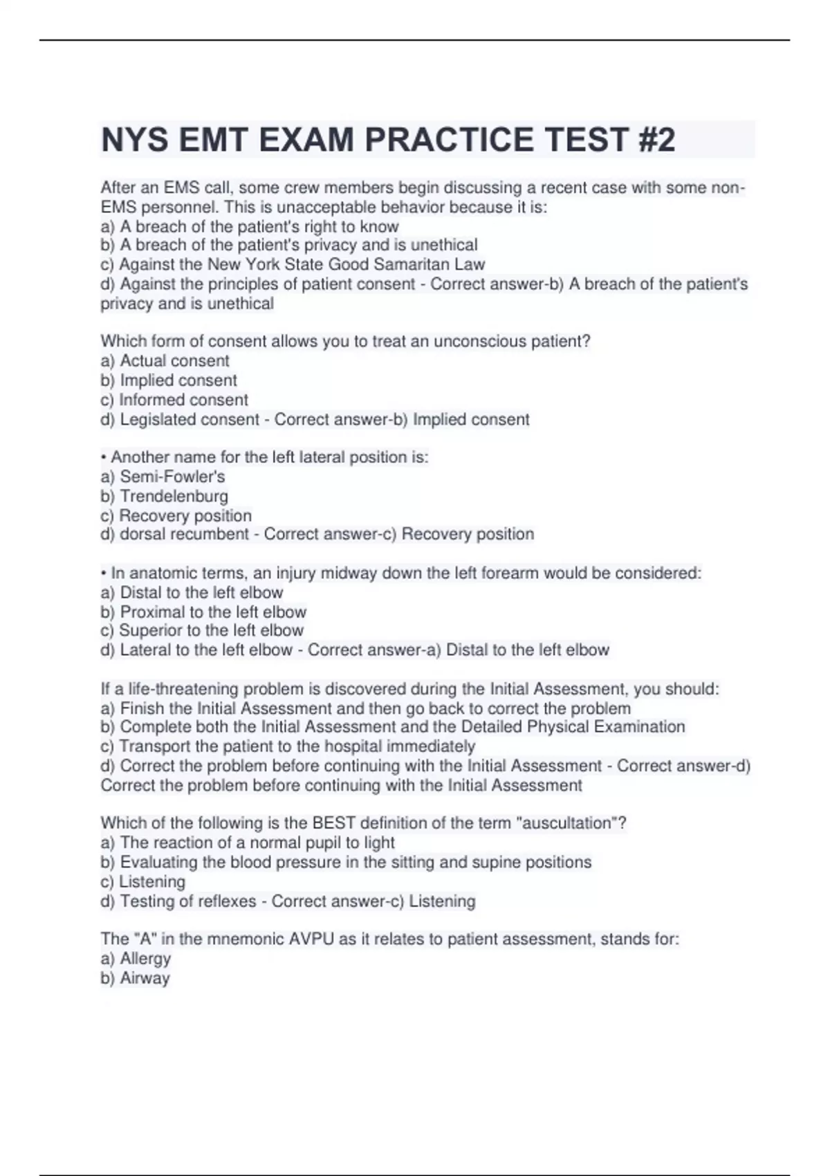 NYS EMT EXAM PRACTICE TEST #2 Questions and Answers